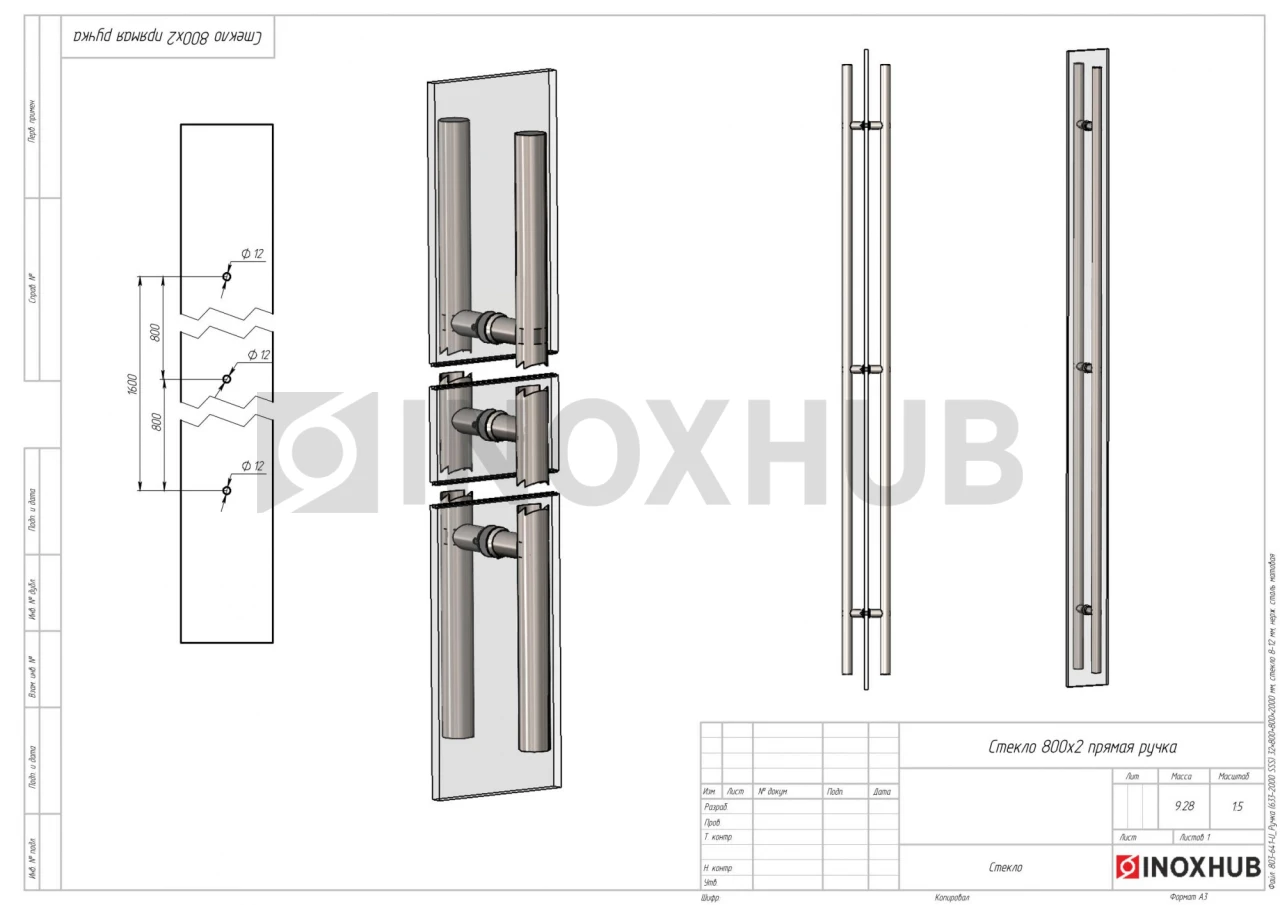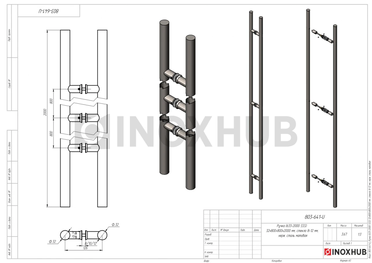 Ручка (633-2000 SSS) 32×800+800×2000 мм, стекло 8-12 мм, нерж. сталь матовая