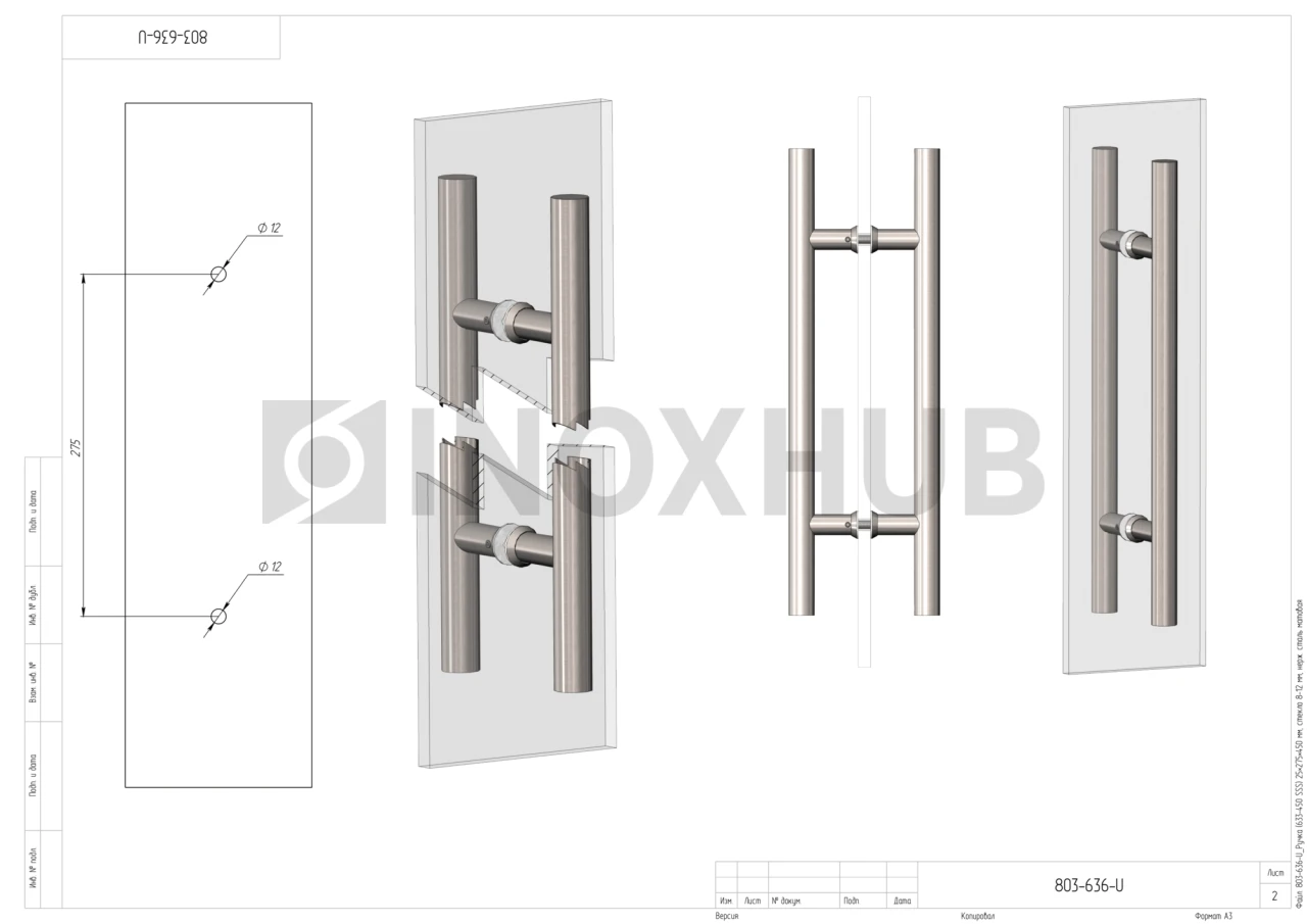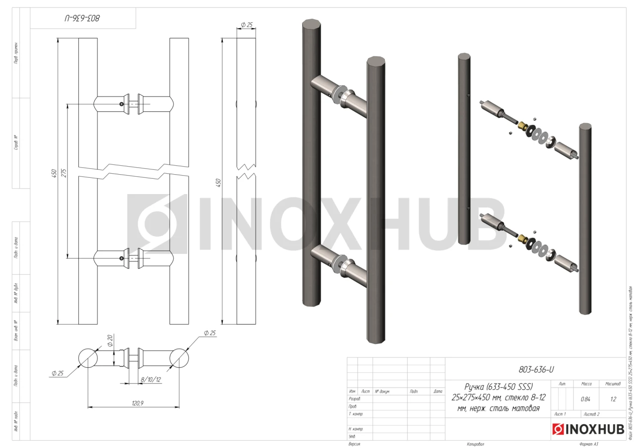 Ручка (633-450 SSS) 25×275×450 мм, стекло 8-12 мм, нерж. сталь матовая