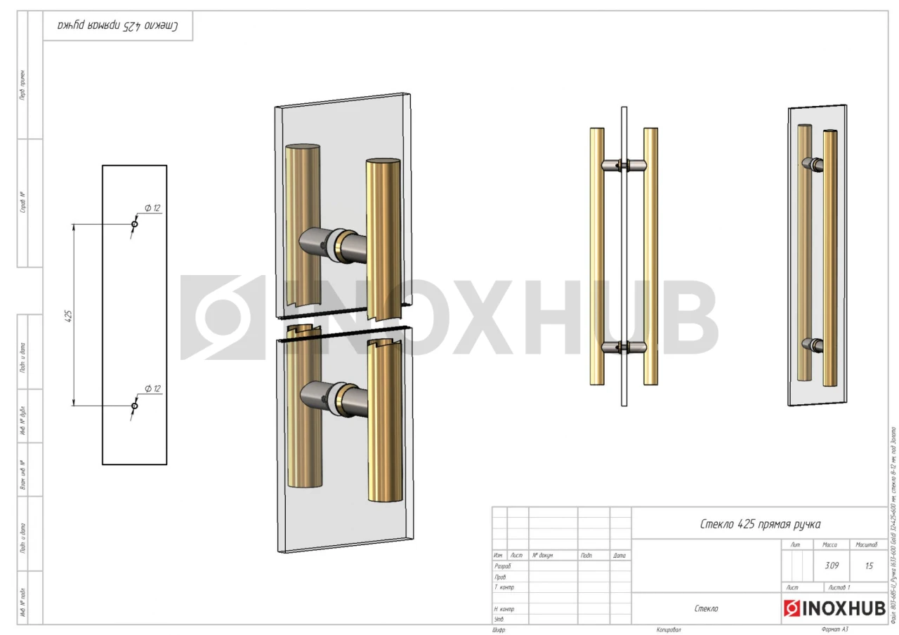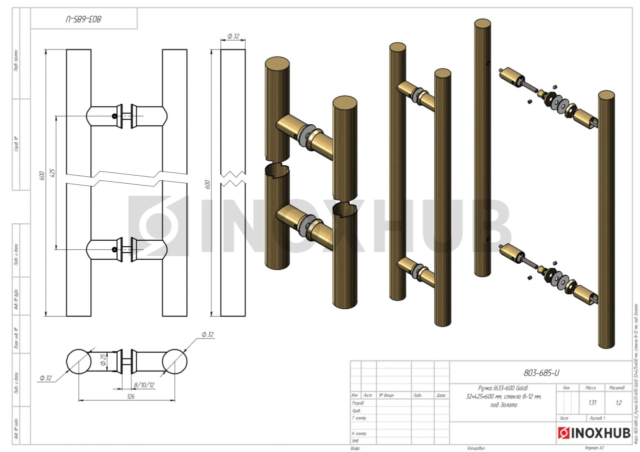 Ручка (633-600 Gold) 32×425×600 мм, стекло 8-12 мм, под Золото