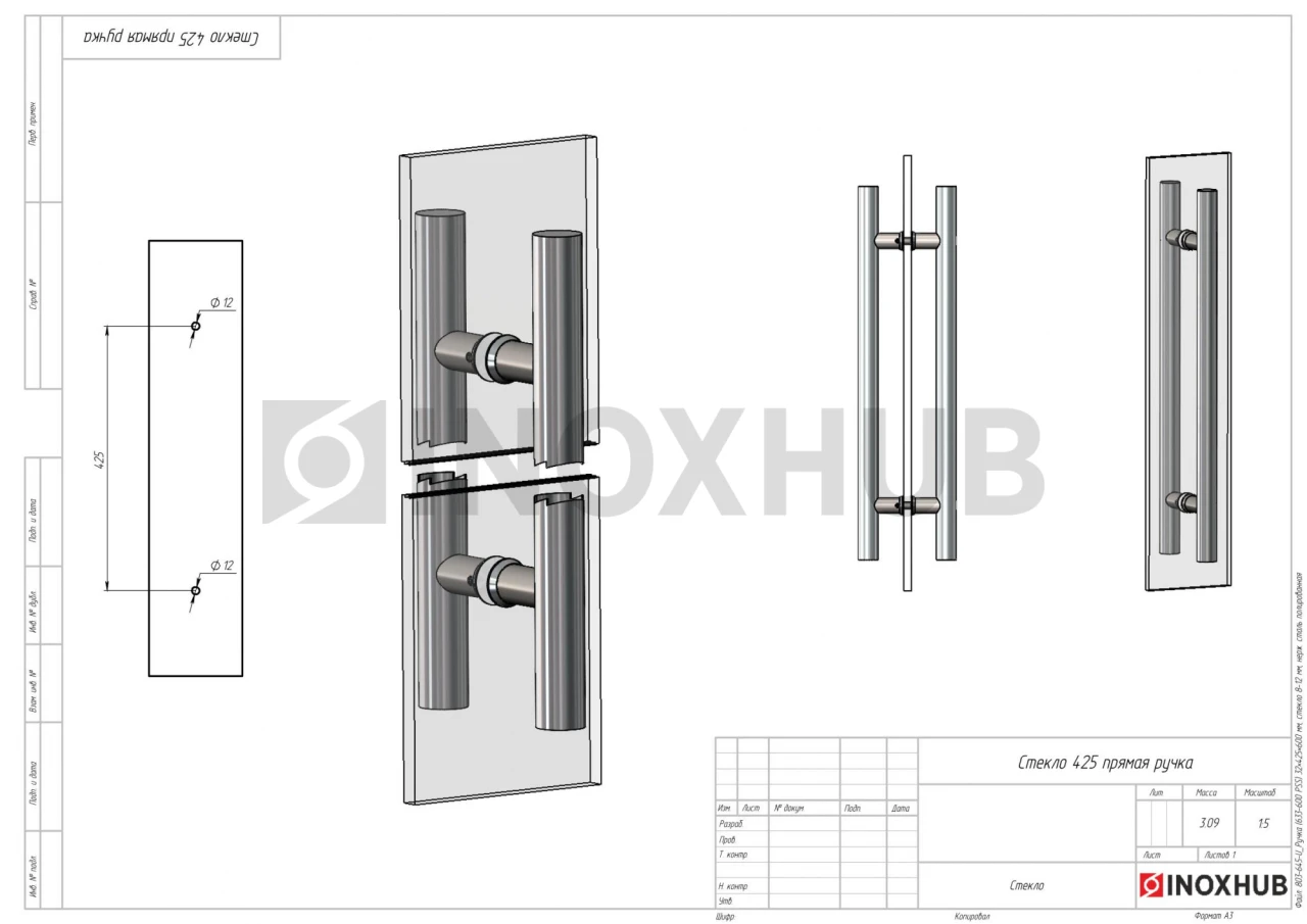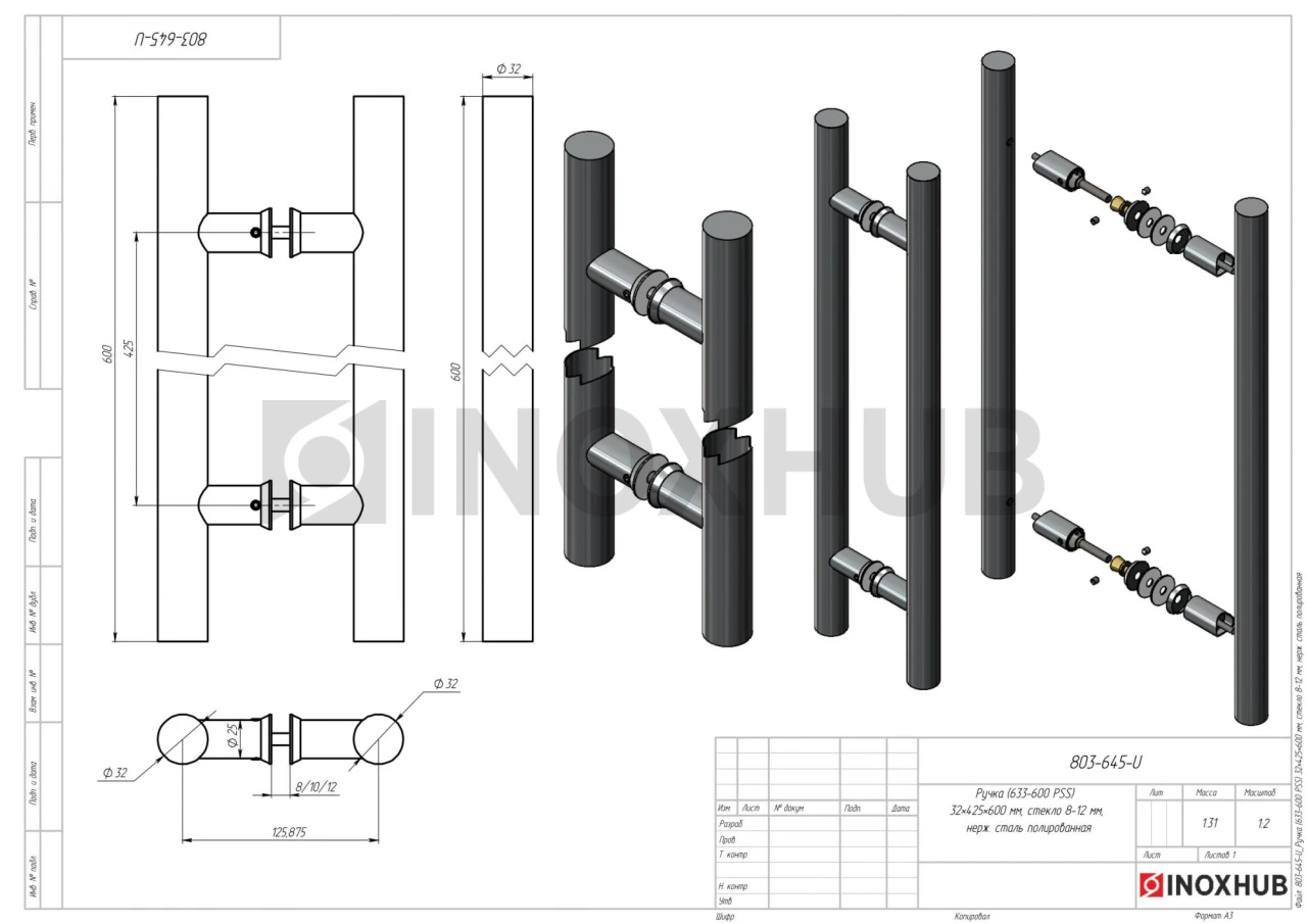 Ручка (633-600 PSS) 32×425×600 мм, стекло 8-12 мм, нерж. сталь полированная