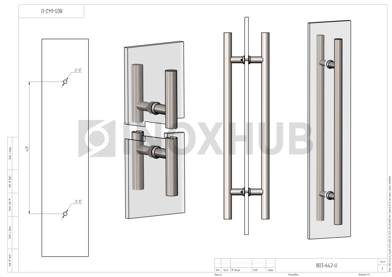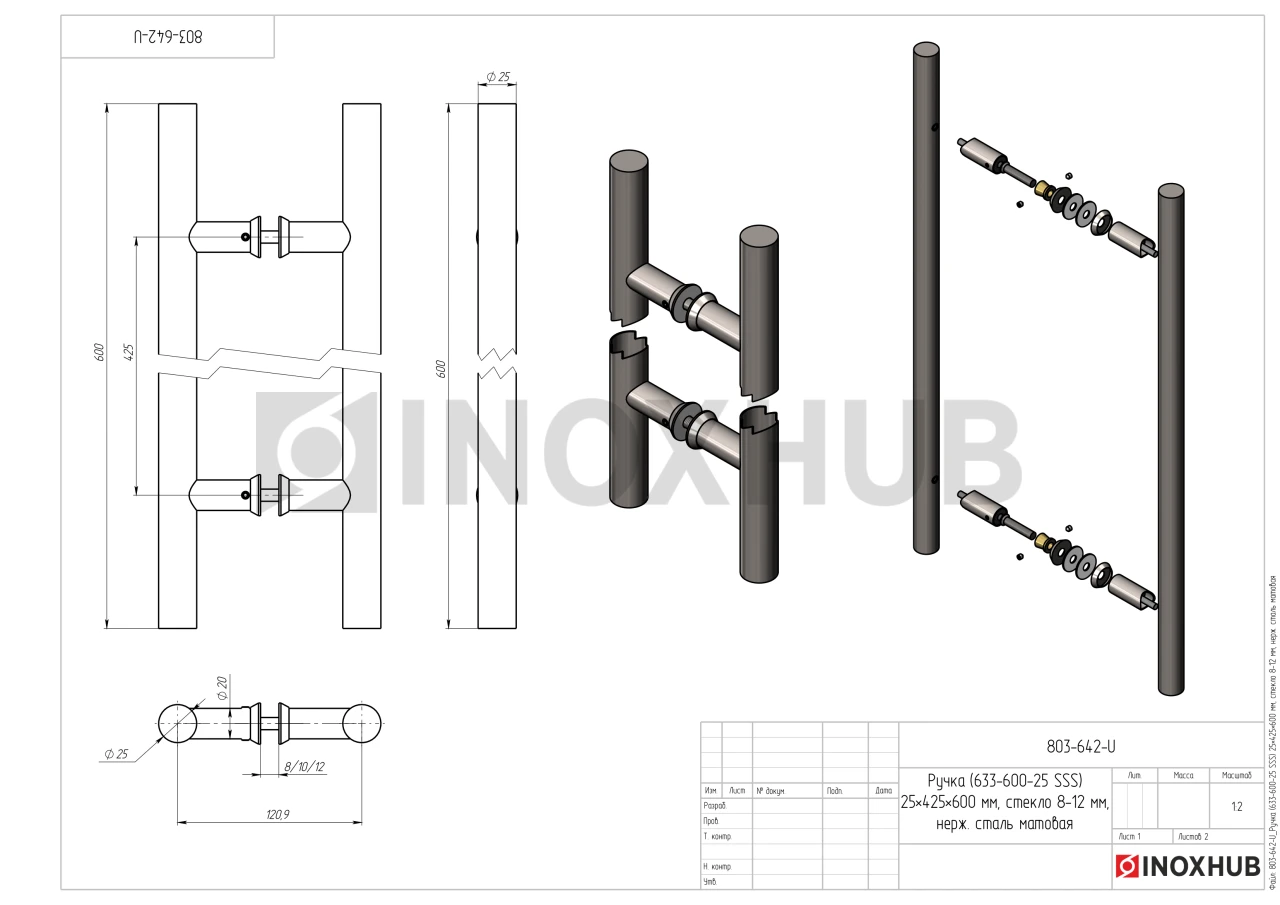Ручка (633-600 SSS) 25×425×600 мм, стекло 8-12 мм, нерж. сталь матовая
