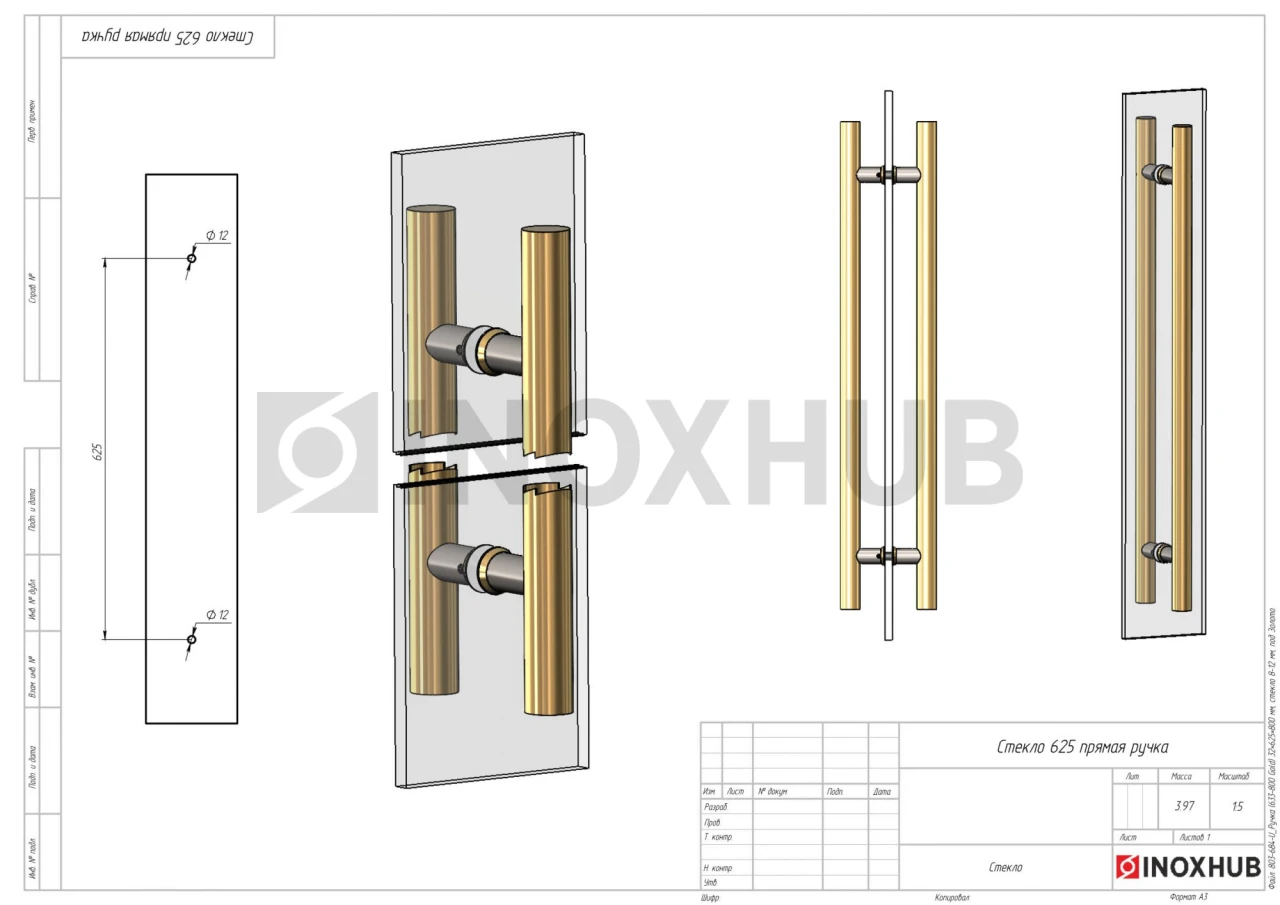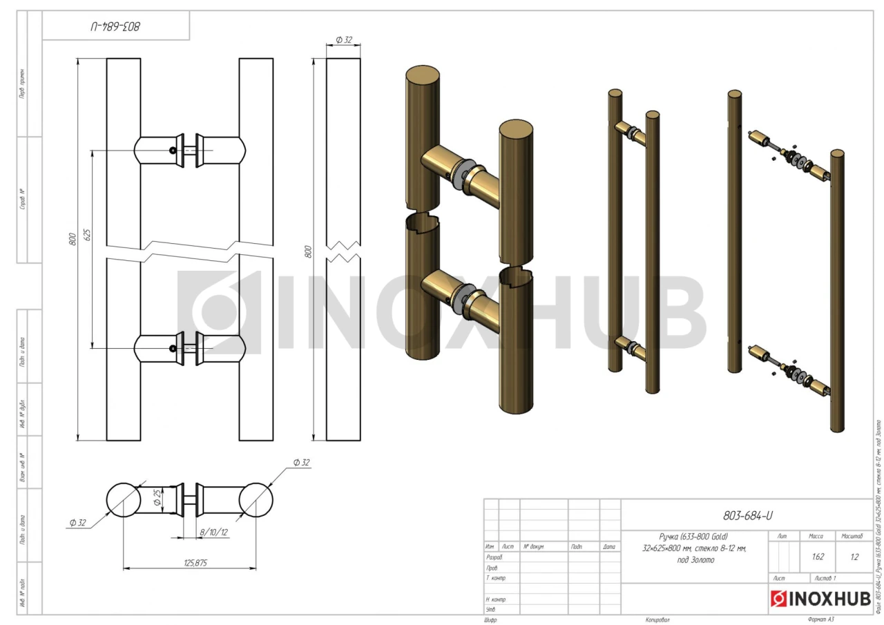 Ручка (633-800 Gold) 32×625×800 мм, стекло 8-12 мм, под Золото