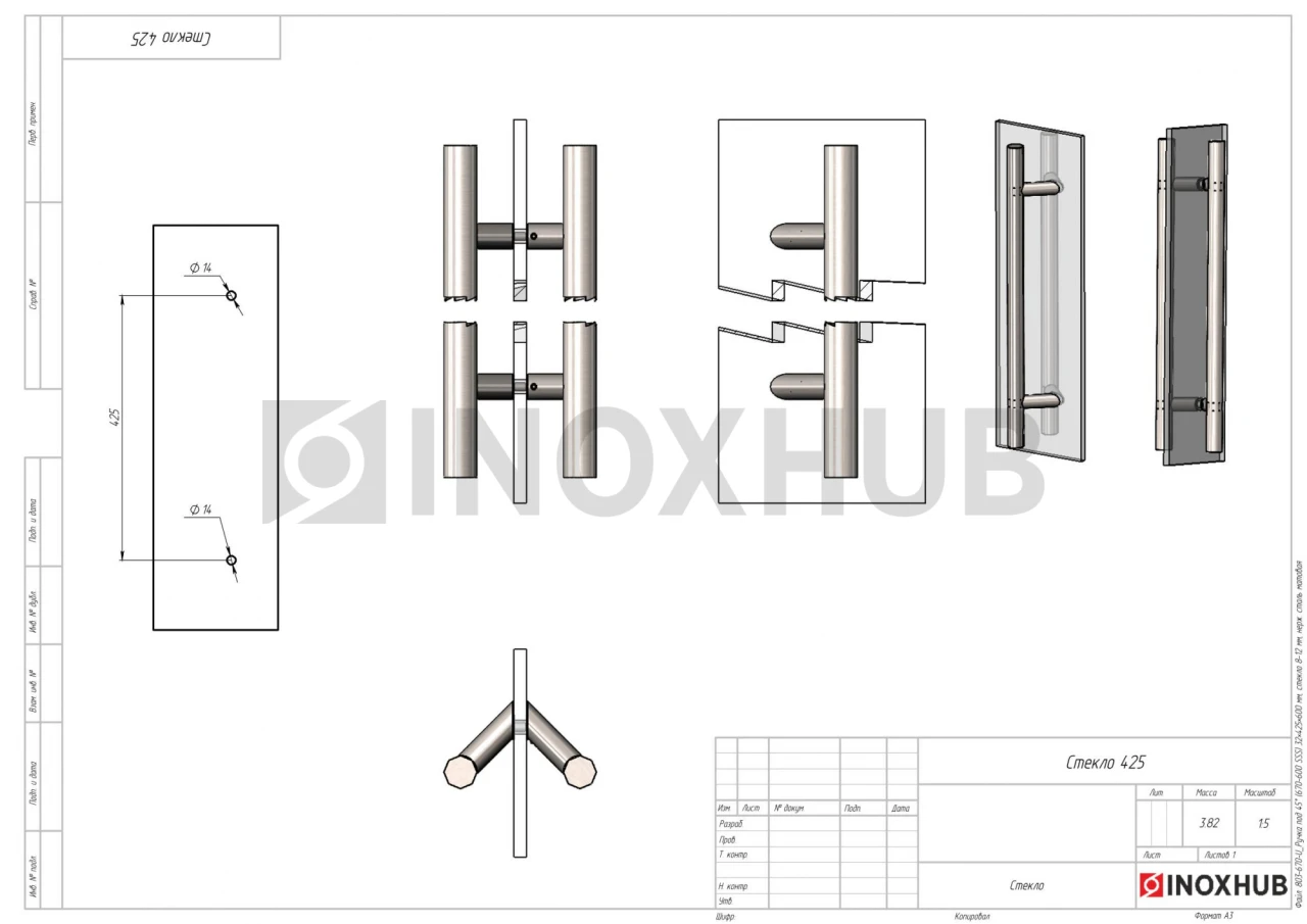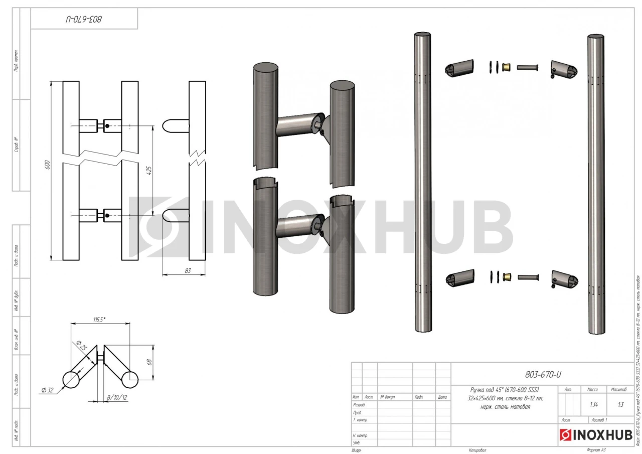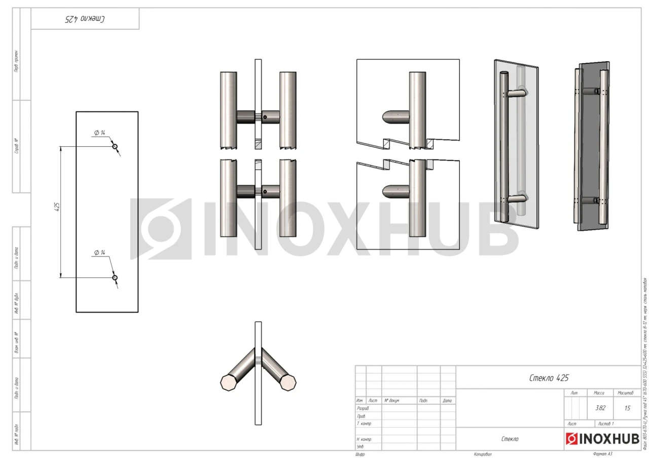 Ручка под 45° (670-600 SSS) 32×425×600 мм, стекло 8-12 мм, нерж. сталь матовая