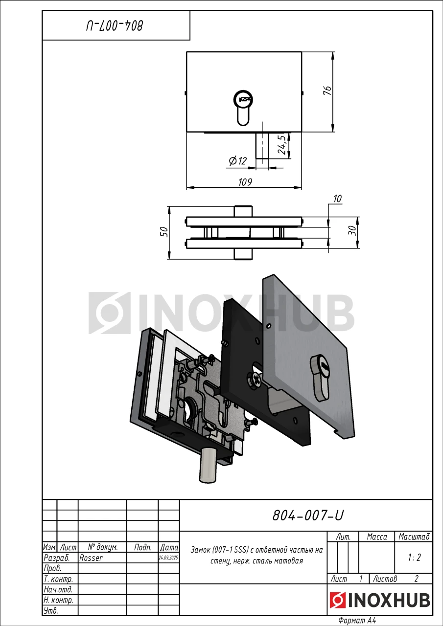 Замок (007-1 SSS) с ответной частью на стену, нерж. сталь матовая