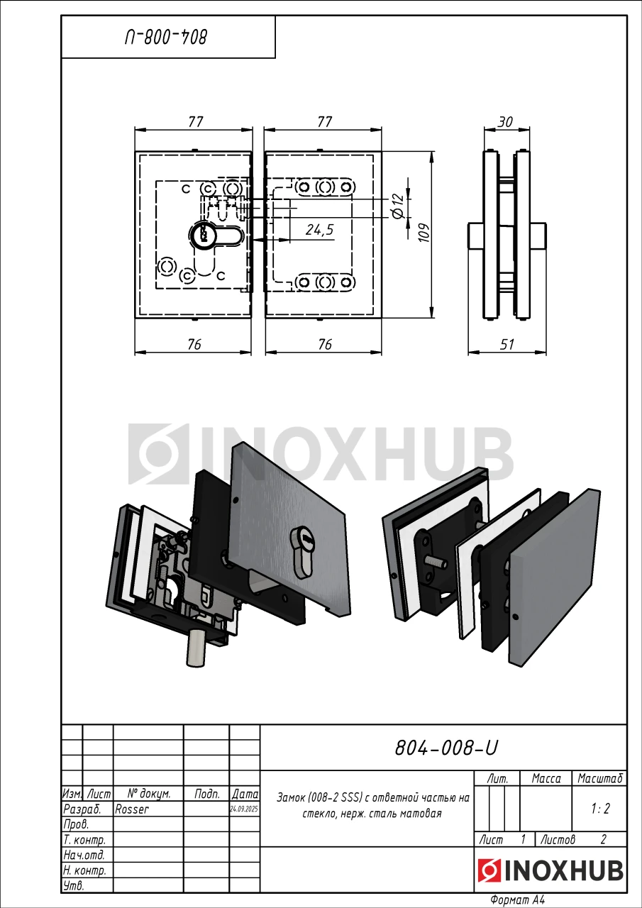 Замок (007-2 SSS) с ответной частью на стекло, нерж. сталь матовая
