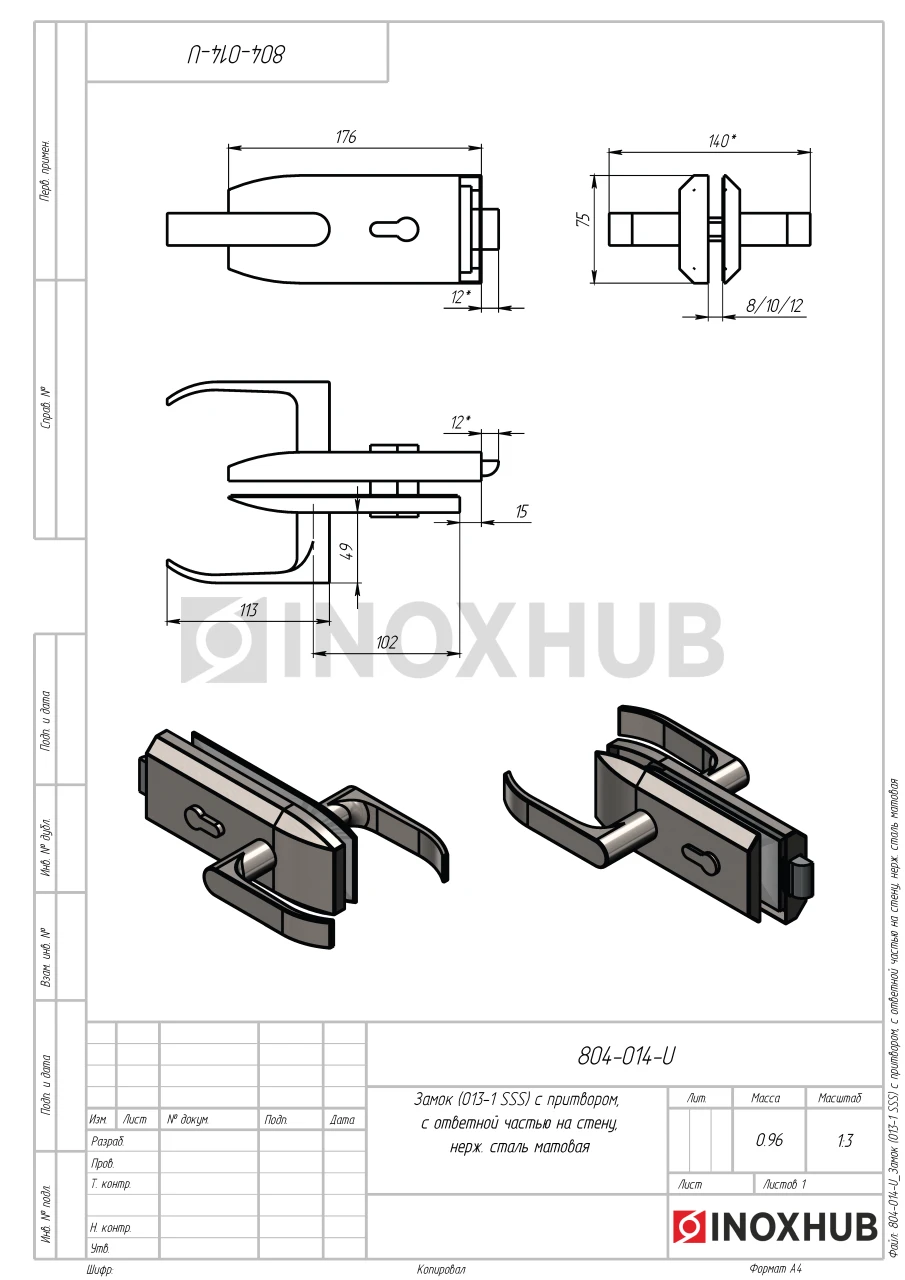 Замок (013-1 SSS) с притвором, с ответной частью на стену, нерж. сталь матовая