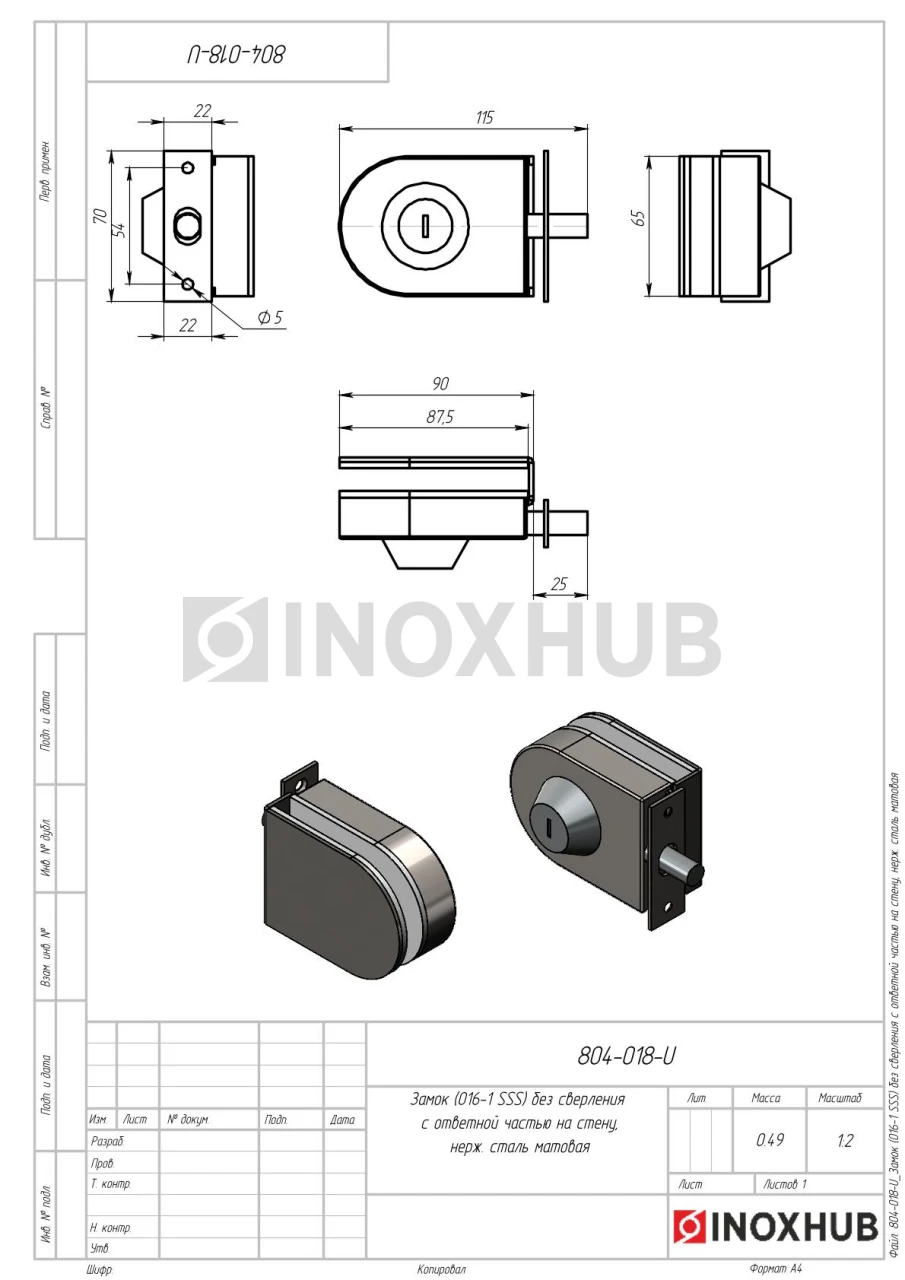 Замок (016-1 SSS) без сверления, с ответной частью на стену, нерж. сталь матовая