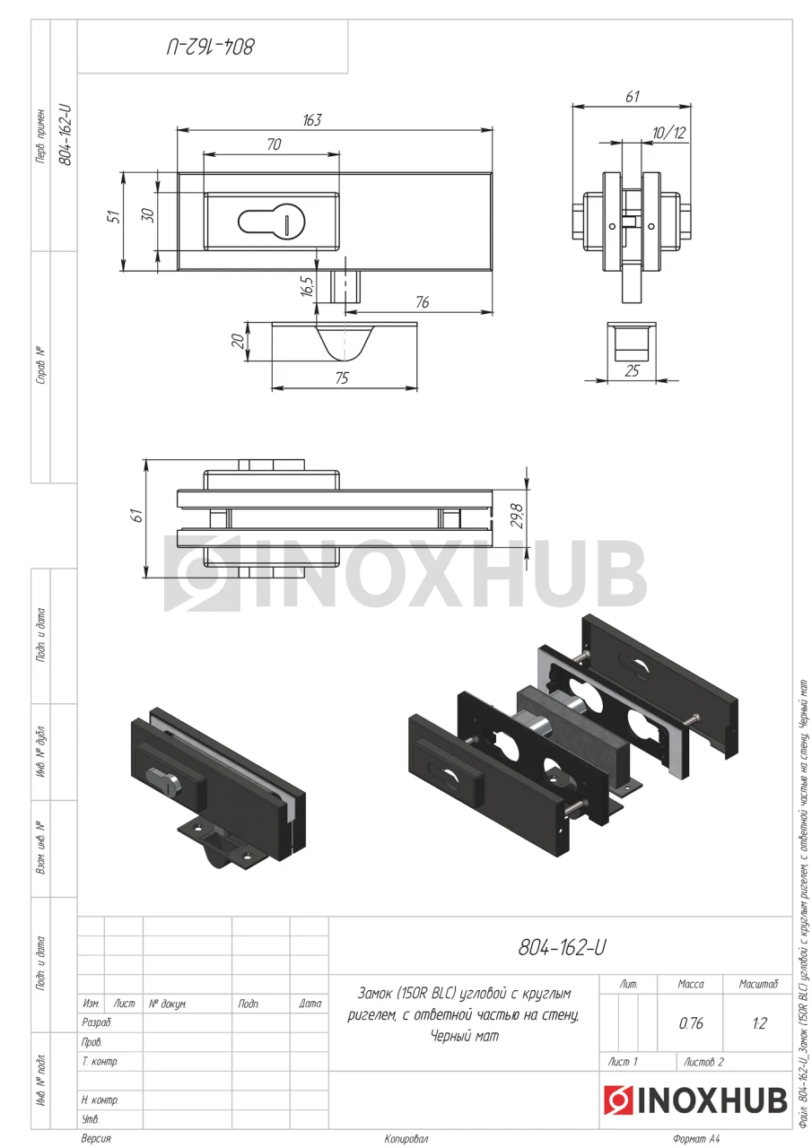 Замок (150R BLC) угловой с круглым ригелем, с ответной частью на стену, Черный мат