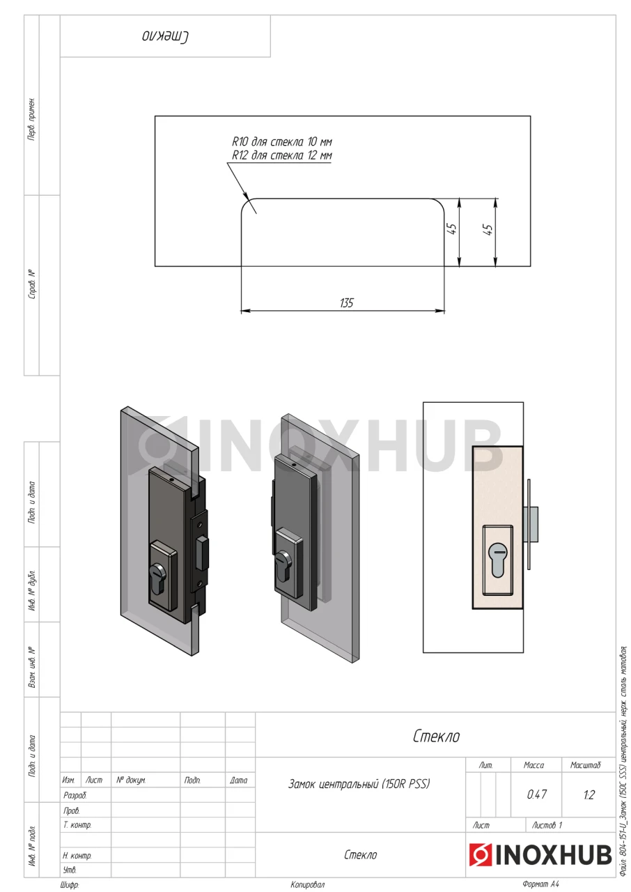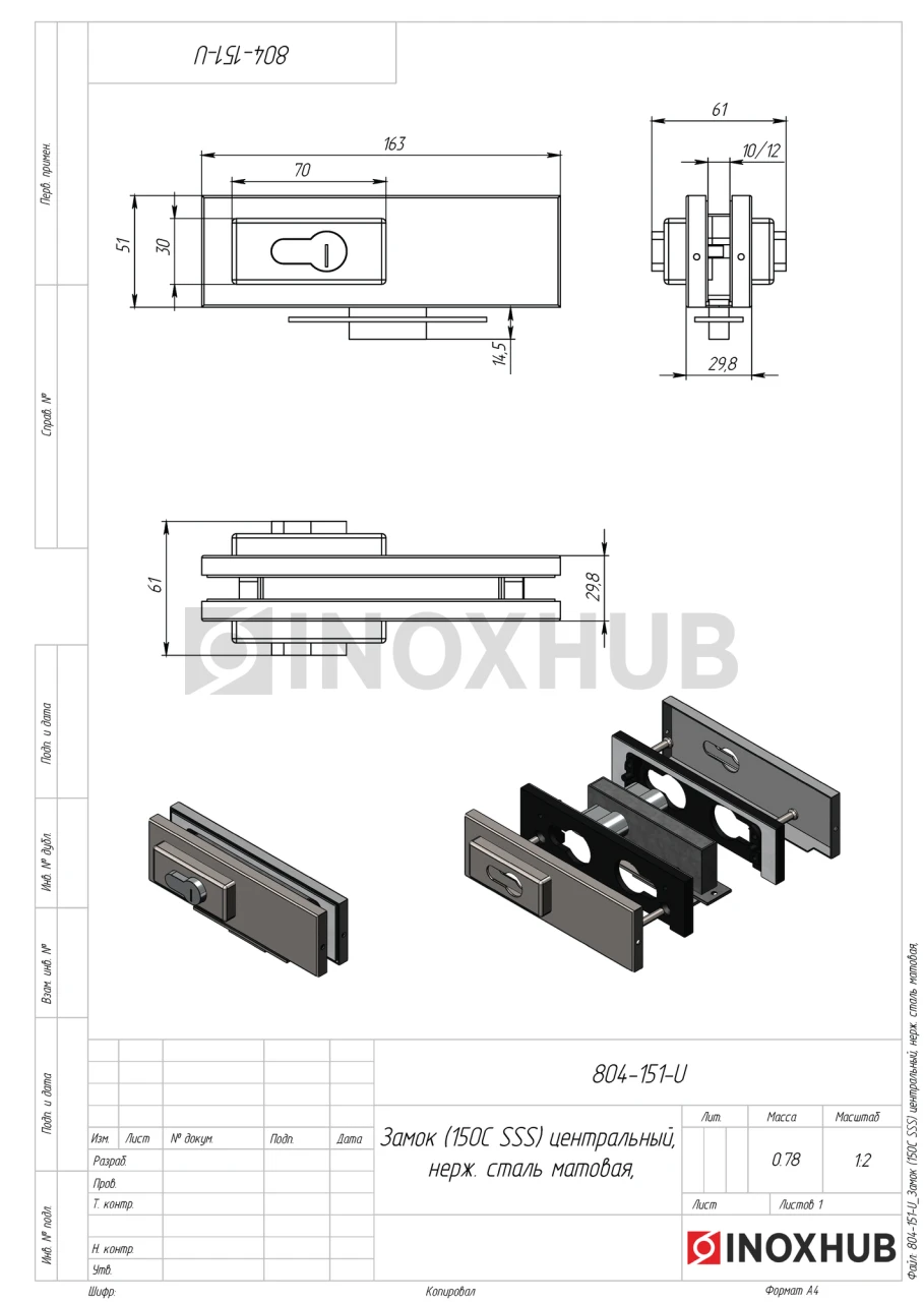 Замок (150С SSS) центральный с прямоугольным ригелем, нерж. сталь матовая
