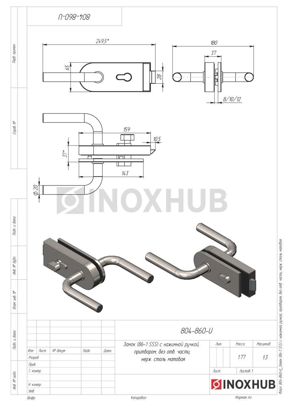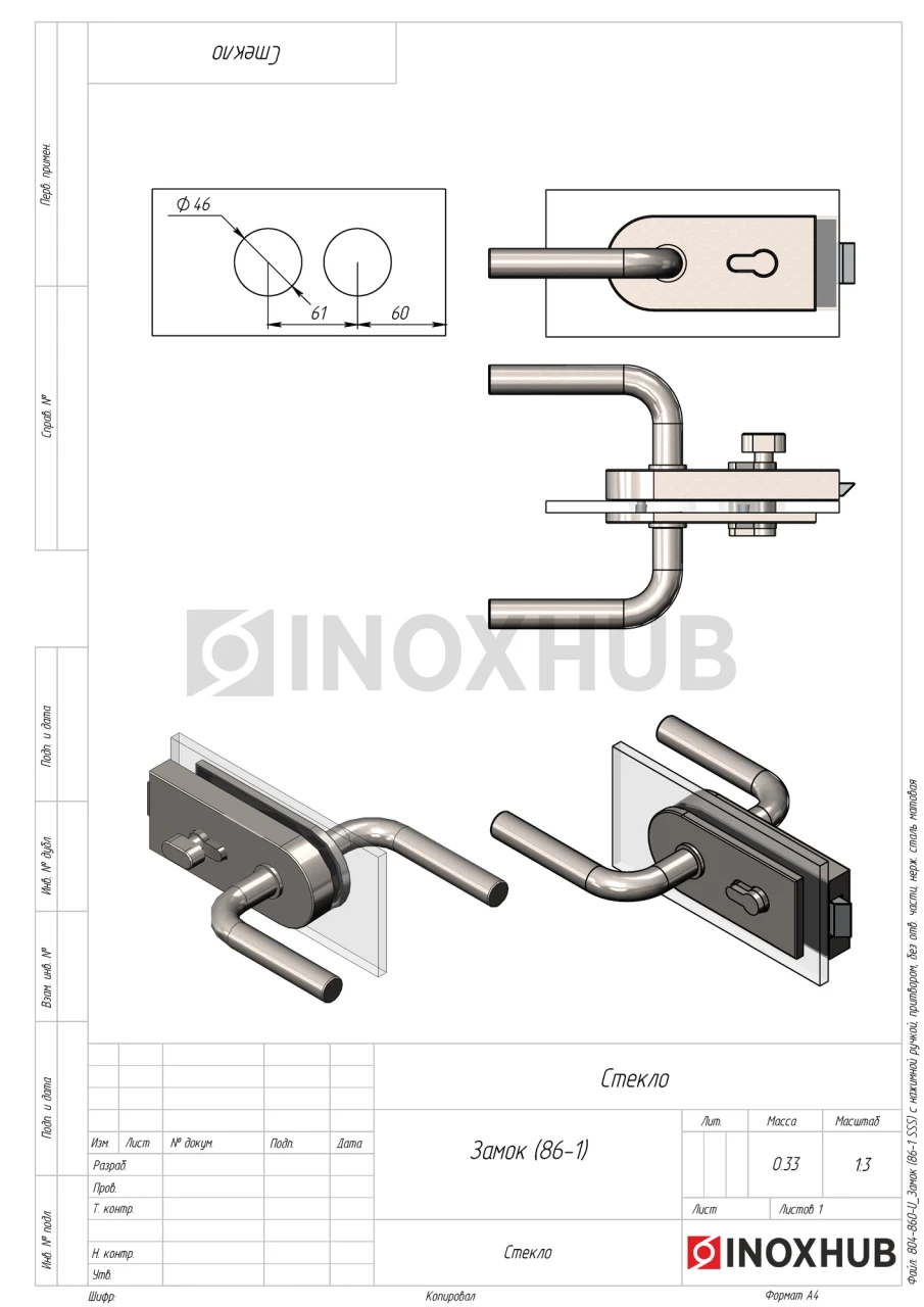 Замок (86-1 SSS) с нажимной ручкой, притвором, без отв. части, нерж. сталь матовая