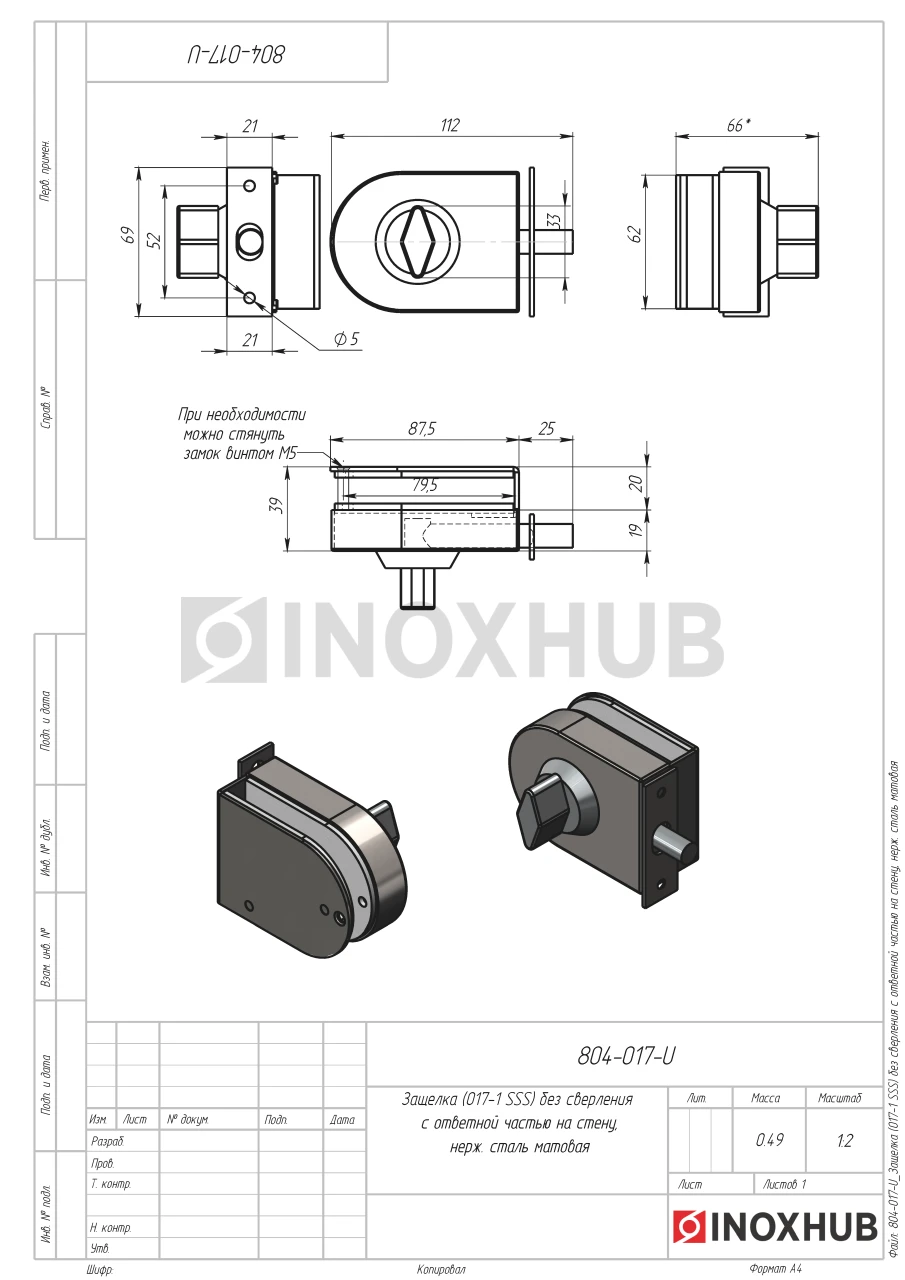 Защелка (017-1 SSS) без сверления, с ответной частью на стену, нерж. сталь матовая