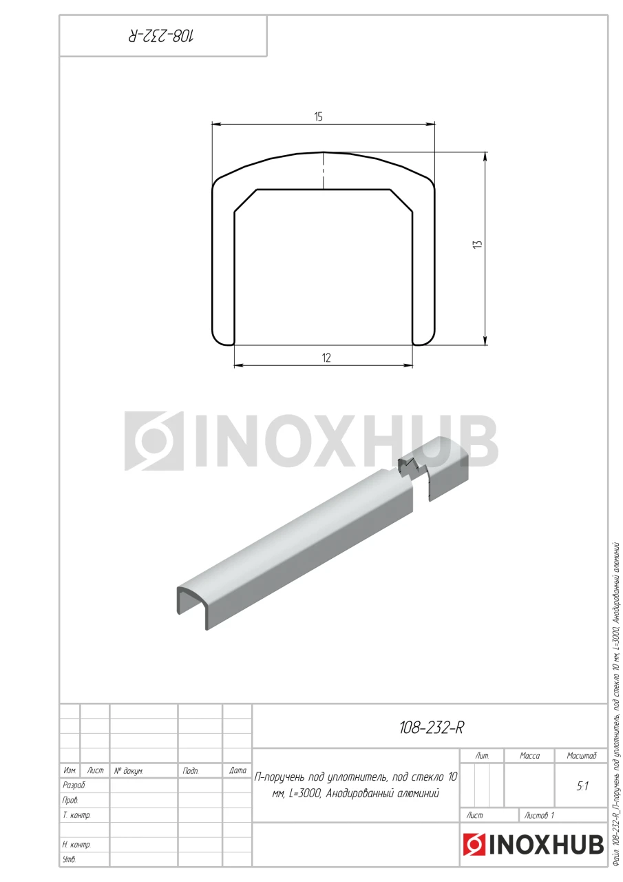 П-поручень под уплотнитель, под стекло 10 мм, L=3000, Анодированный алюминий