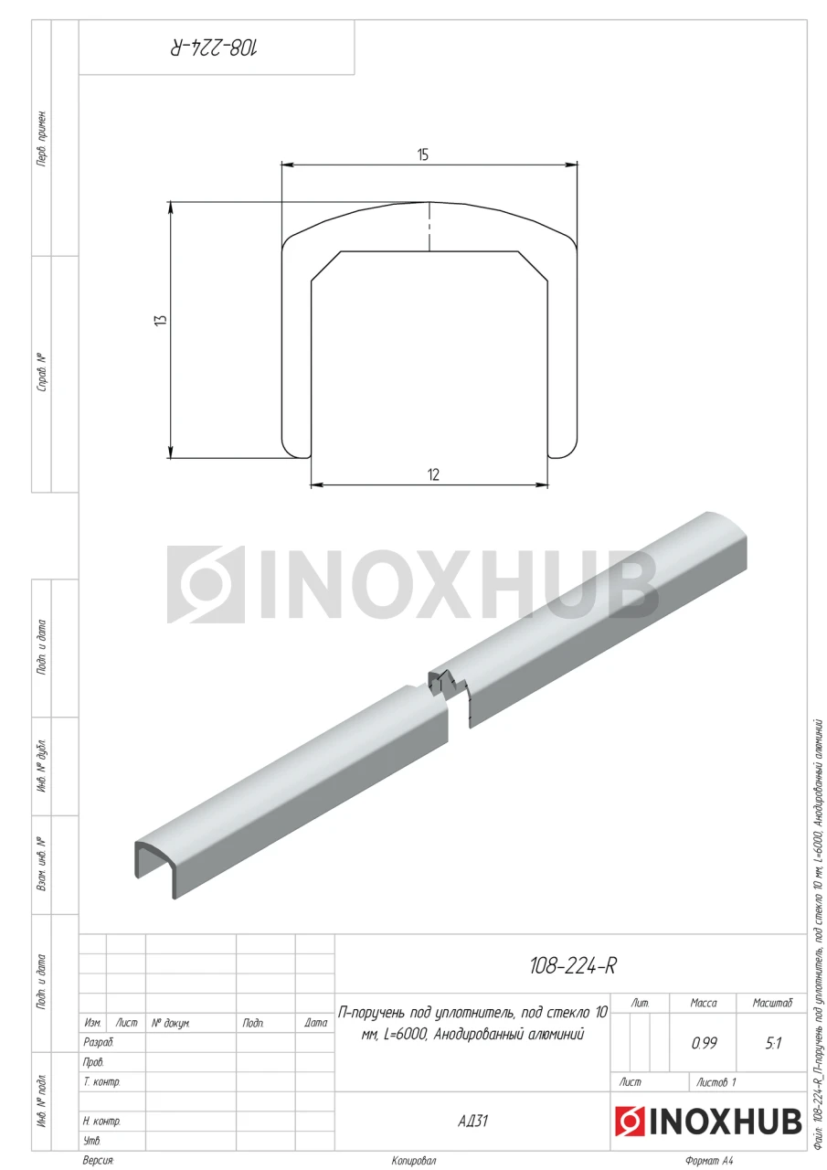 Алюминиевый П-поручень предназначен для установки поверх стекла толщиной 10 мм. Выполнен из анодированного алюминия — материал лёгкий, устойчивый к коррозии, не требует дополнительной обработки. Изделие используется вместе с уплотнителем (в комплект не входит), который обеспечивает плотную посадку стекла без сверления. Длина поручня — 6000 мм, толщина стенки — 1,5 мм, ширина паза — 15 мм.