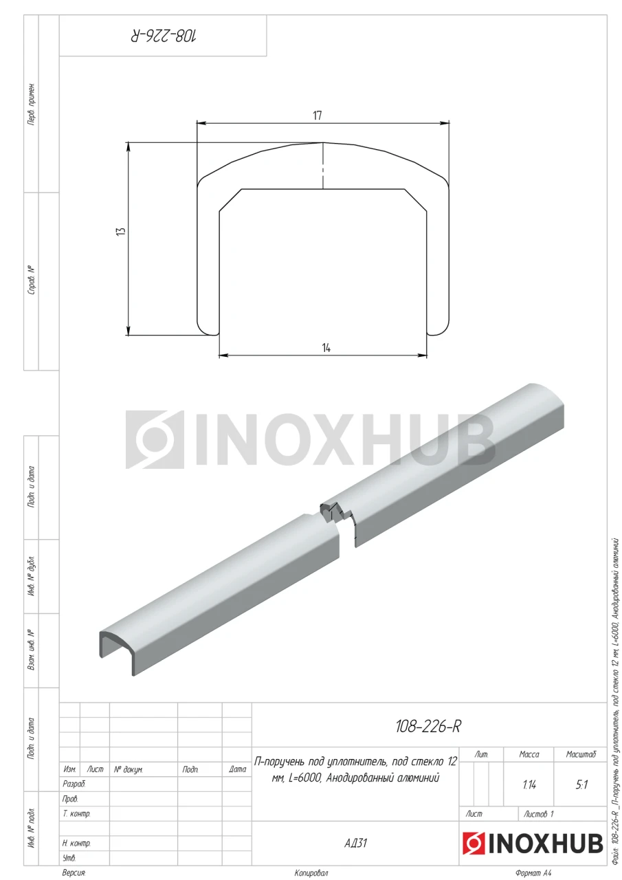 Алюминиевый П-поручень предназначен для установки поверх стекла толщиной 12 мм. Выполнен из анодированного алюминия — материал лёгкий, устойчивый к коррозии, не требует дополнительной обработки. Изделие используется вместе с уплотнителем (в комплект не входит), который обеспечивает плотную посадку стекла без сверления. Длина поручня — 6000 мм, толщина стенки — 1,5 мм, ширина паза — 14 мм.