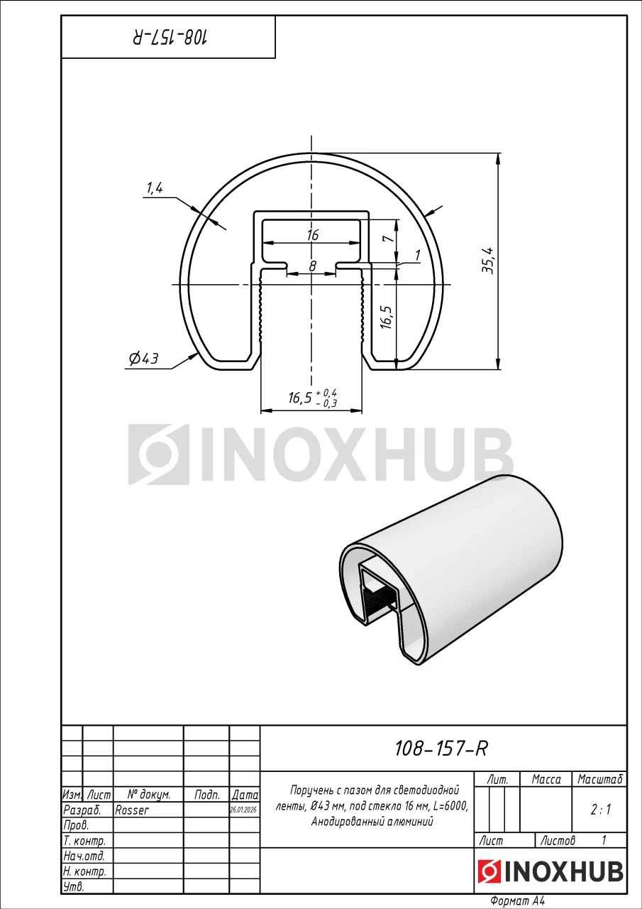 Поручень с пазом для светодиодной ленты, Ø43 мм, под стекло 16 мм, L=6000, Анодированный алюминий