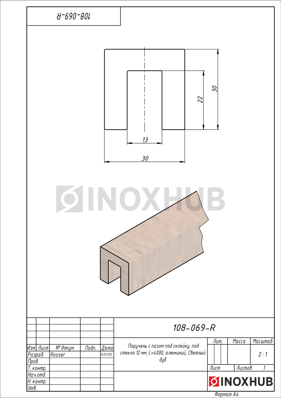 Поручень с пазом под склейку, под стекло 12 мм, L=4000, алюминий, Светлый дуб