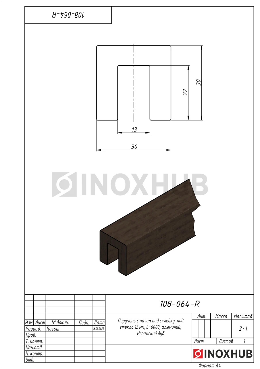 Поручень с пазом под склейку, под стекло 12 мм, L=4000, алюминий, Испанский дуб