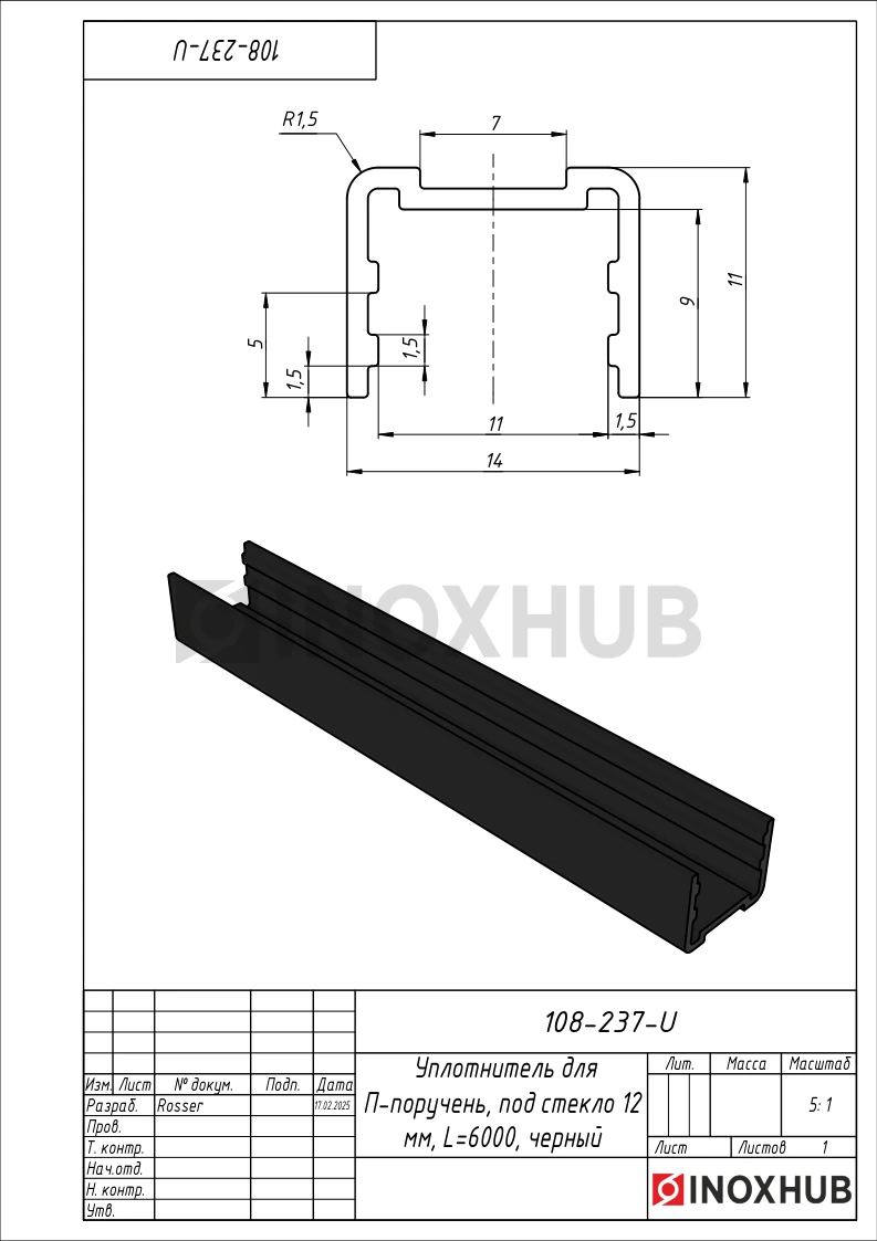 Уплотнитель для П-поручень, под стекло 12 мм, L=6000, черный