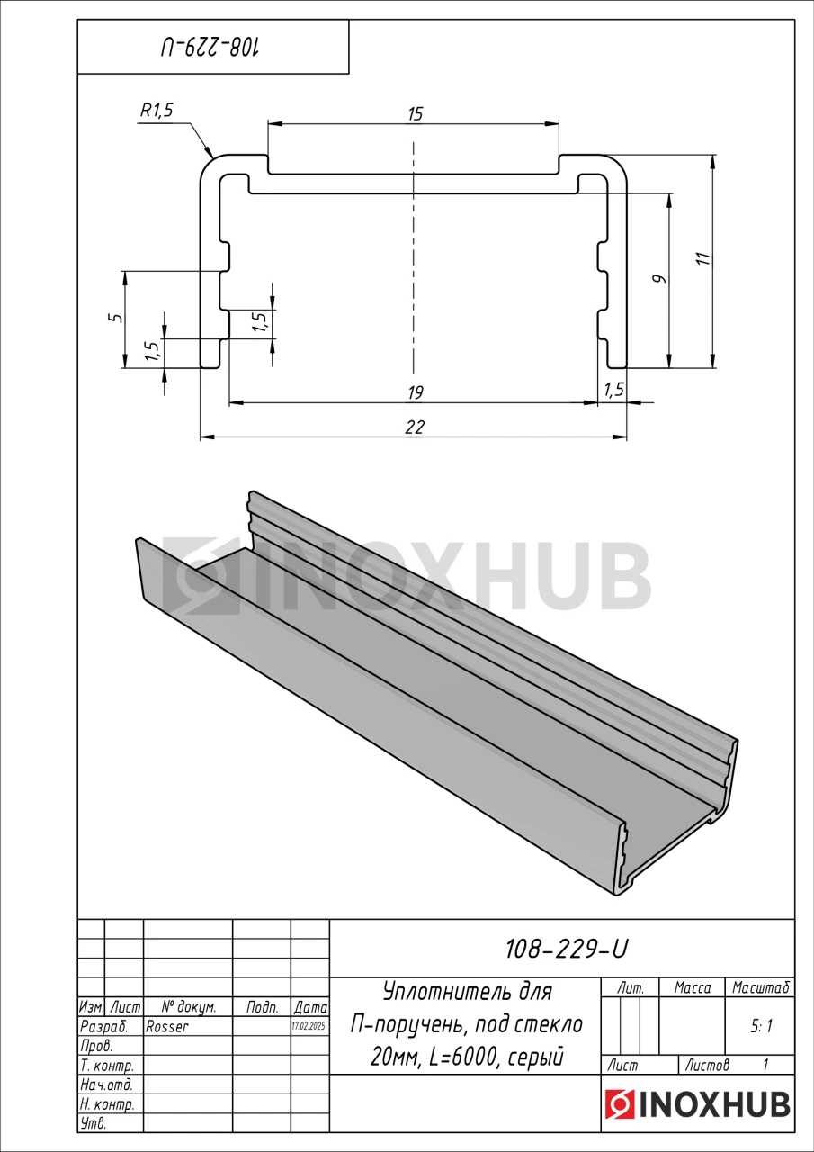 Уплотнитель для П-поручень, под стекло 20 мм, L=6000, серый в продаже и под заказ. Оперативная доставка со склада в Москве. Все товары соответствуют стандартам качества.