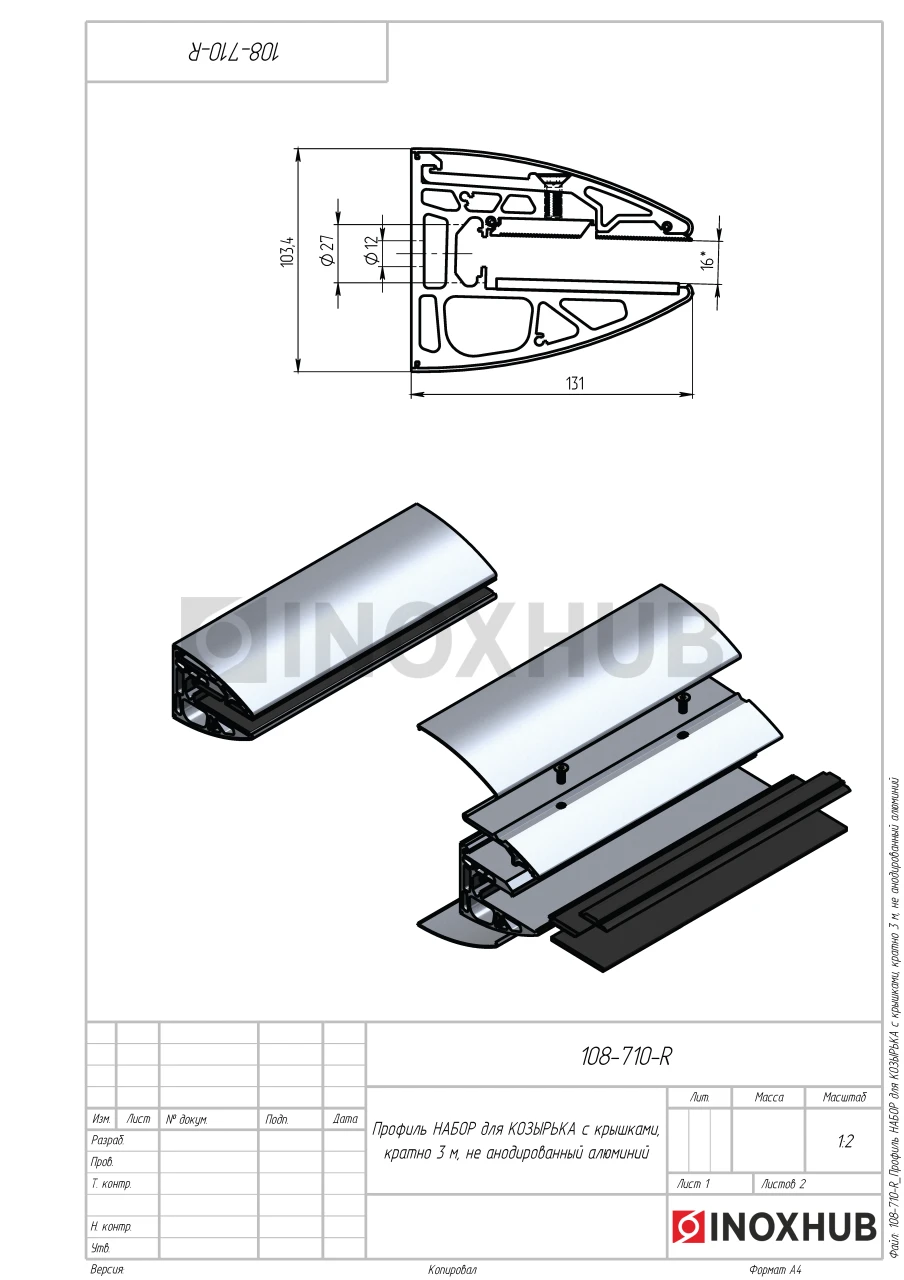 Профиль НАБОР для КОЗЫРЬКА с крышками, кратно 3 м, не анодированный алюминий