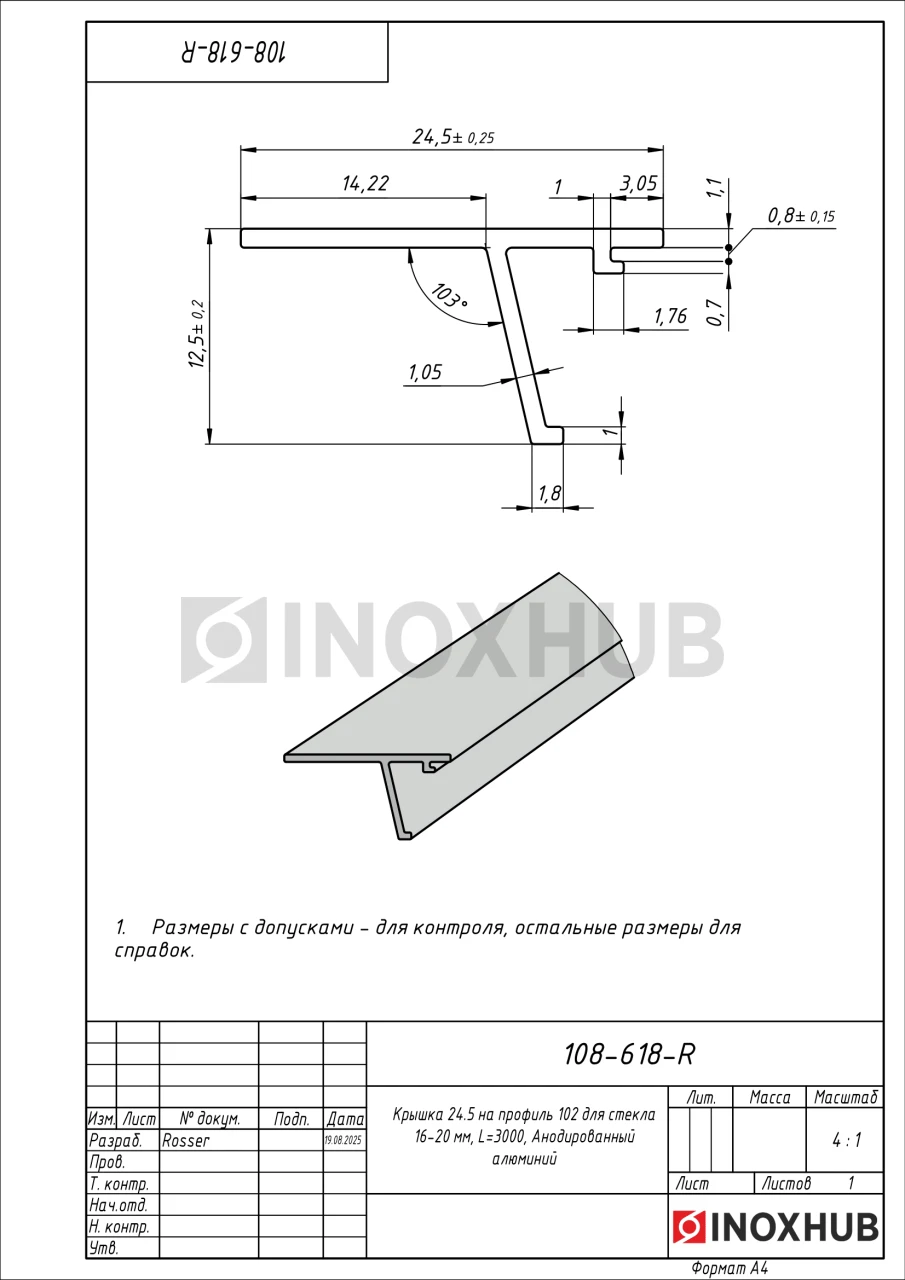 Крышка 24.5 на профиль 102 для стекла 16-20 мм, L=3000, Анодированный алюминий