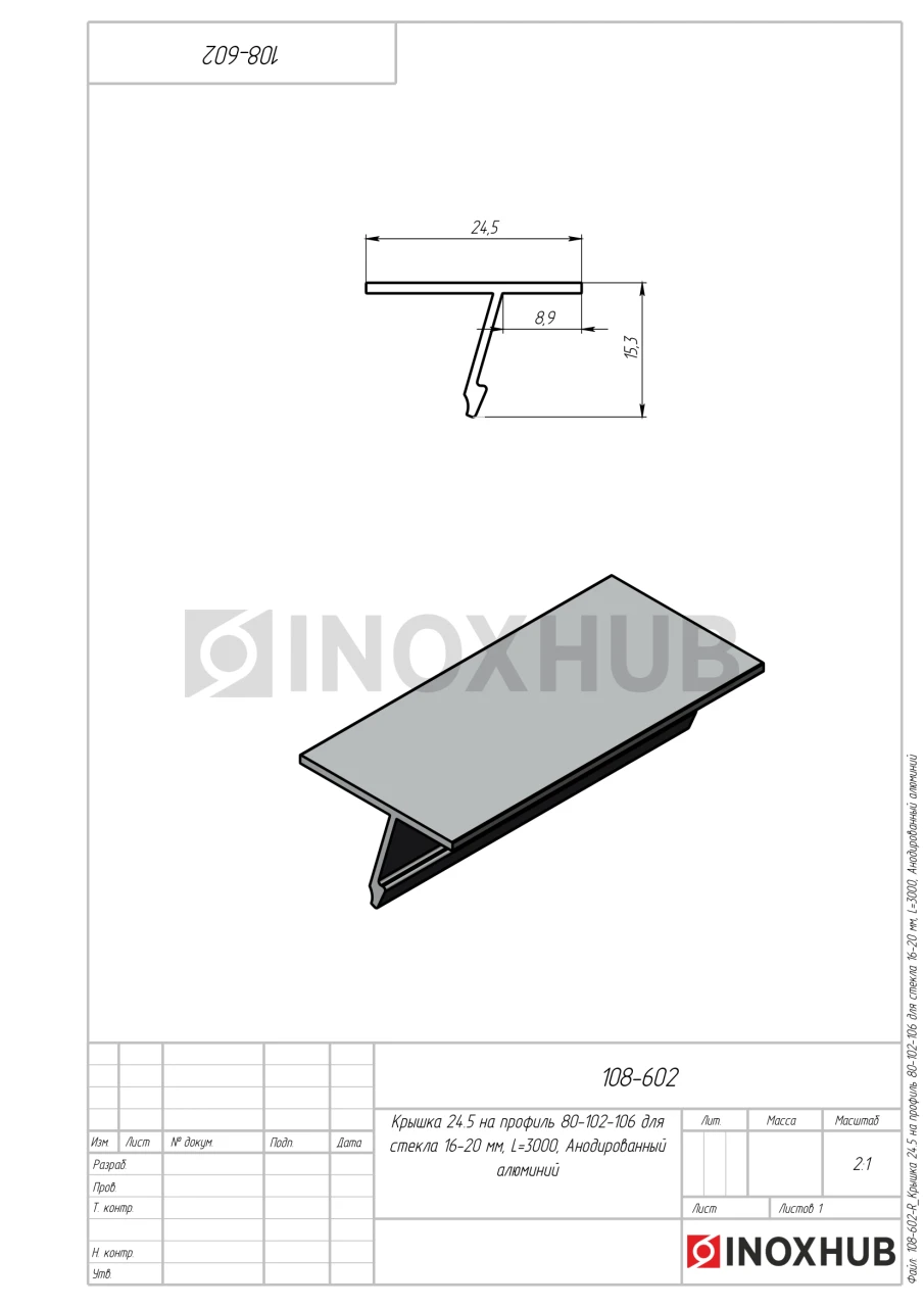Крышка 24.5 на профиль 80/102/106 для стекла 16-20 мм, L=3000, Анодированный алюминий