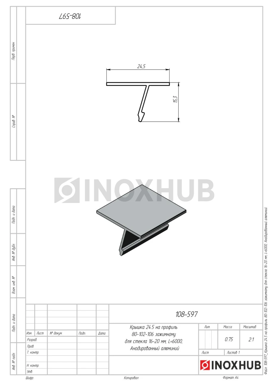 Крышка 24.5 на профиль 80/102/106 для стекла 16-20 мм, L=6000, Анодированный алюминий