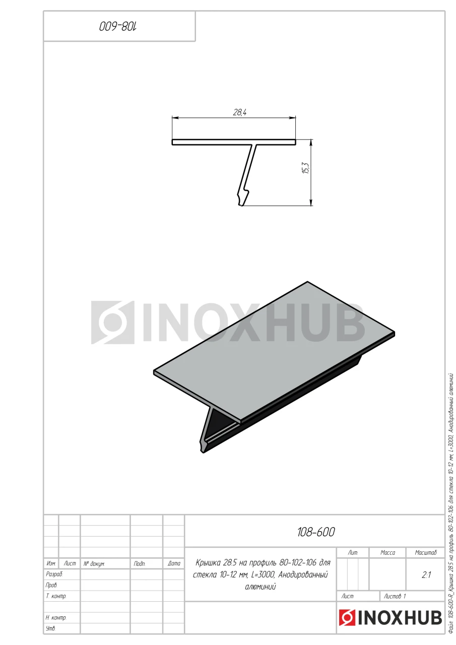 Крышка 28.5 на профиль 80/102/106 для стекла 10-12 мм, L=3000, Анодированный алюминий