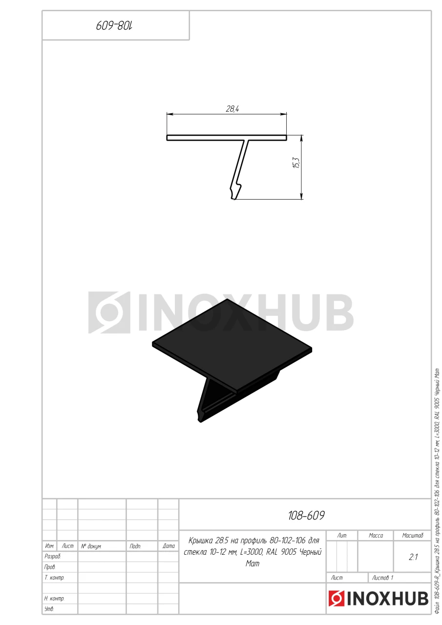 Крышка 28.5 на профиль 80/102/106 для стекла 10-12 мм, L=3000, RAL 9005 Черный Мат