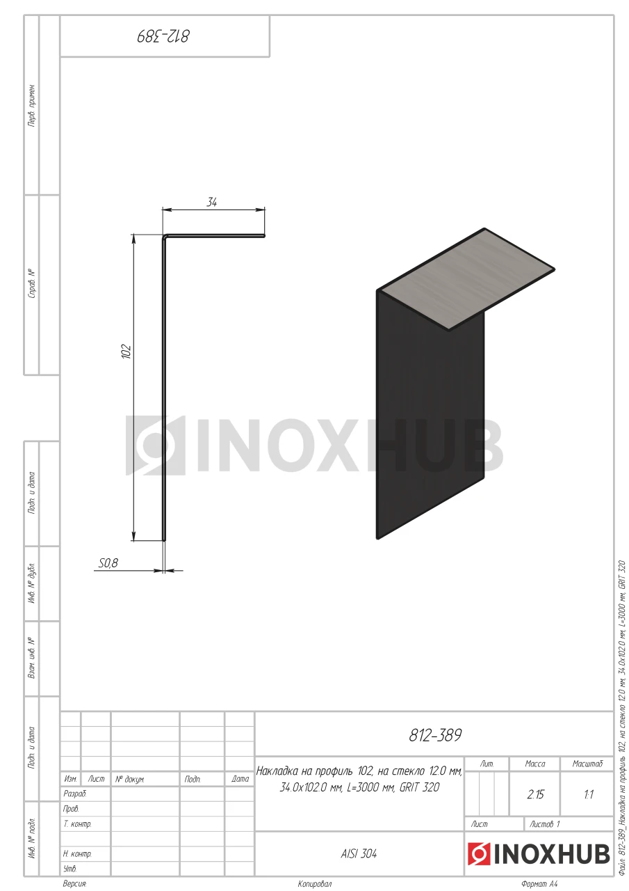 Накладка на профиль 102, на стекло 12.0 мм, 34.0х102.0 мм, L=3000 мм, GRIT 320