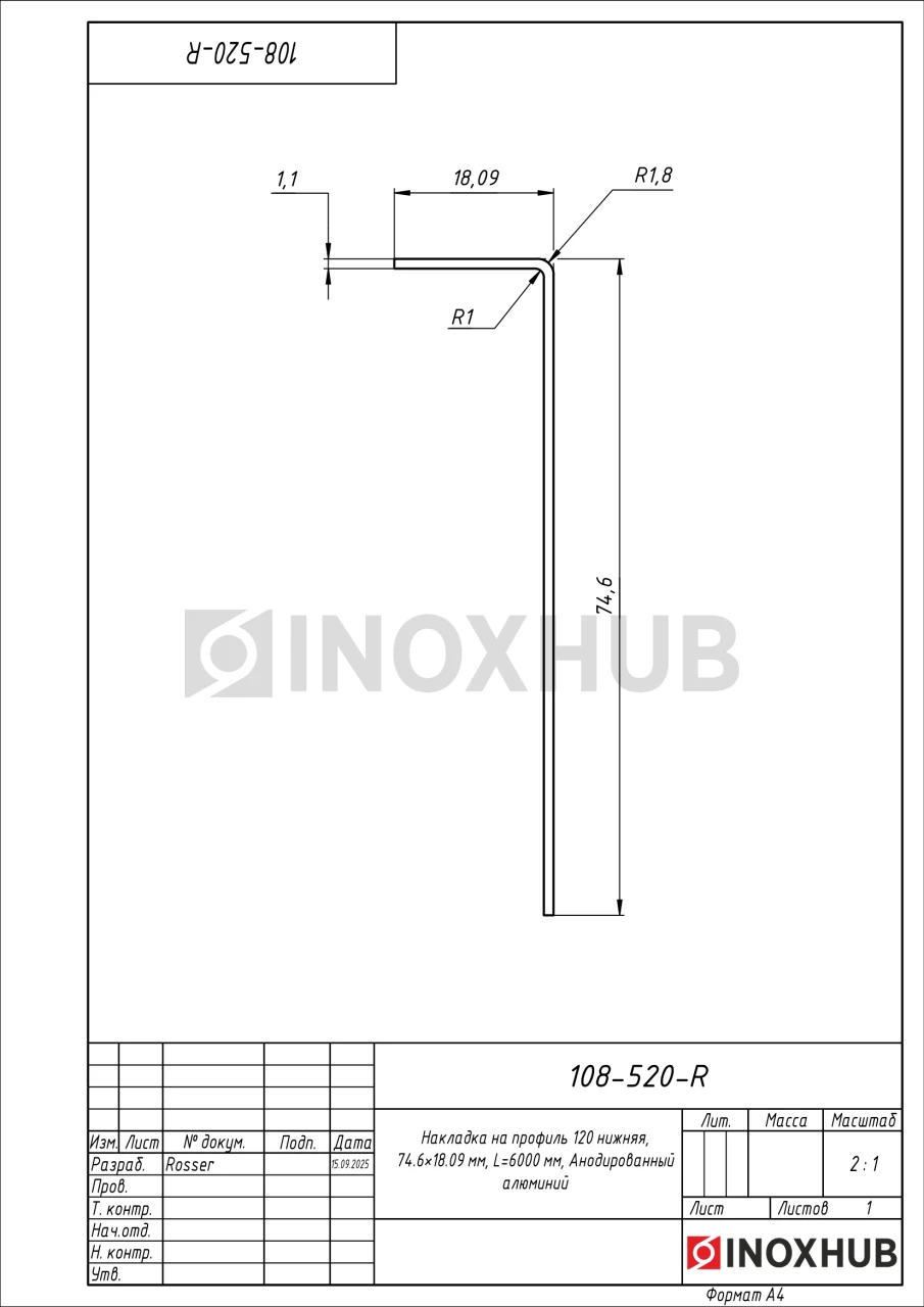 Накладка на профиль 120 нижняя, 74.6×18.09 мм, L=6000 мм, Анодированный алюминий