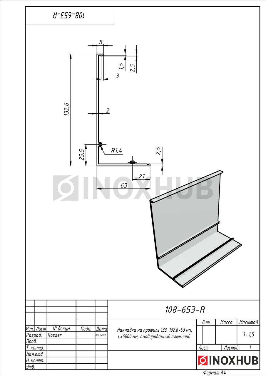 Накладка на профиль 133, 132.6×63 мм, L=6000 мм, Анодированный алюминий