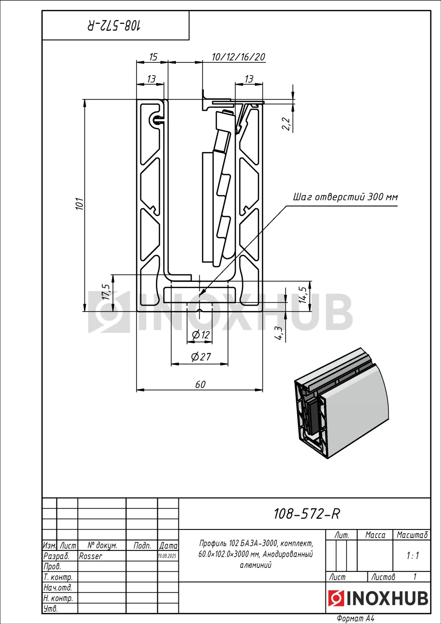 Профиль 102 БАЗА-3000, комплект, 60.0×102.0×3000 мм, Анодированный алюминий