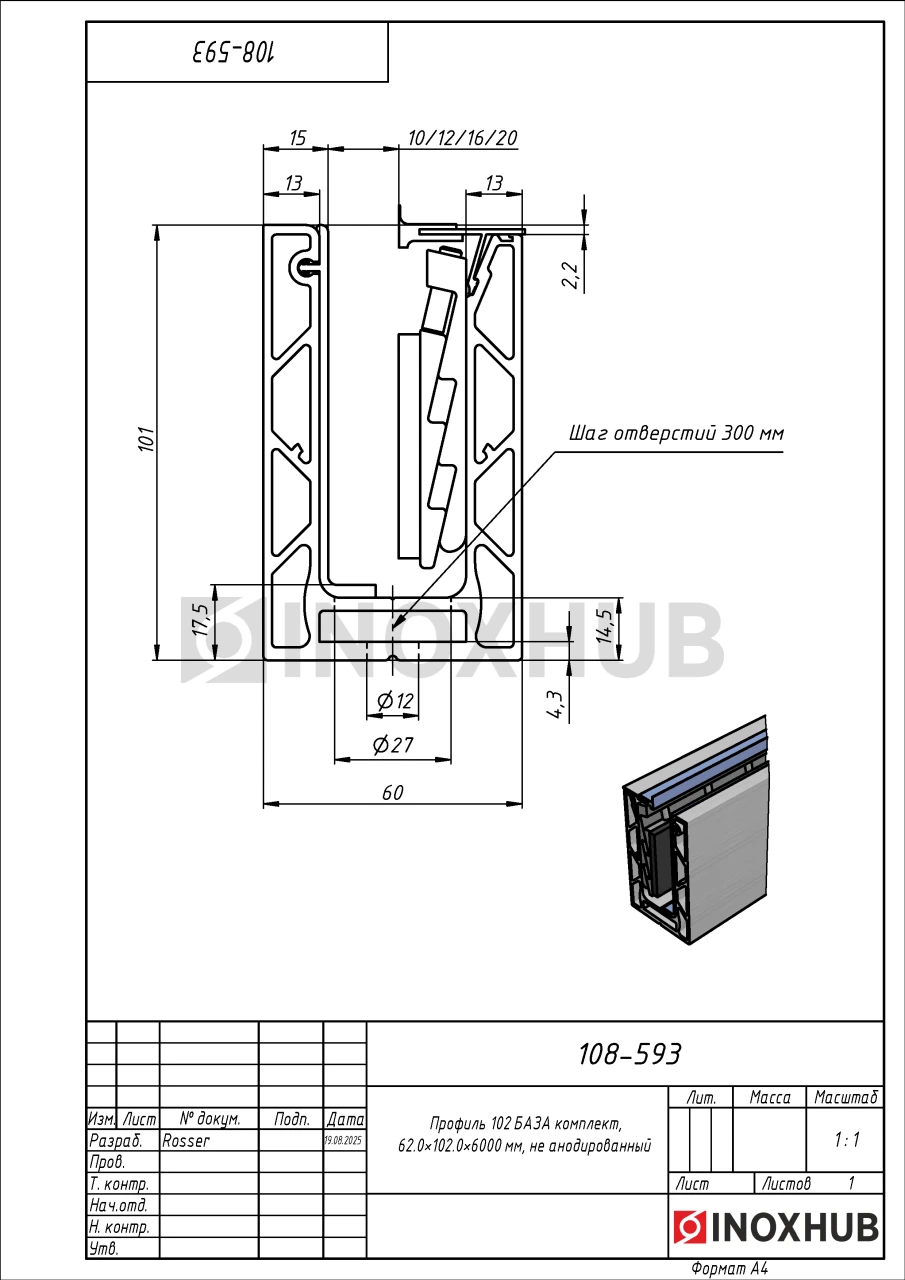 Профиль 102 БАЗА комплект, 60.0×102.0×6000 мм, не анодированный алюминий