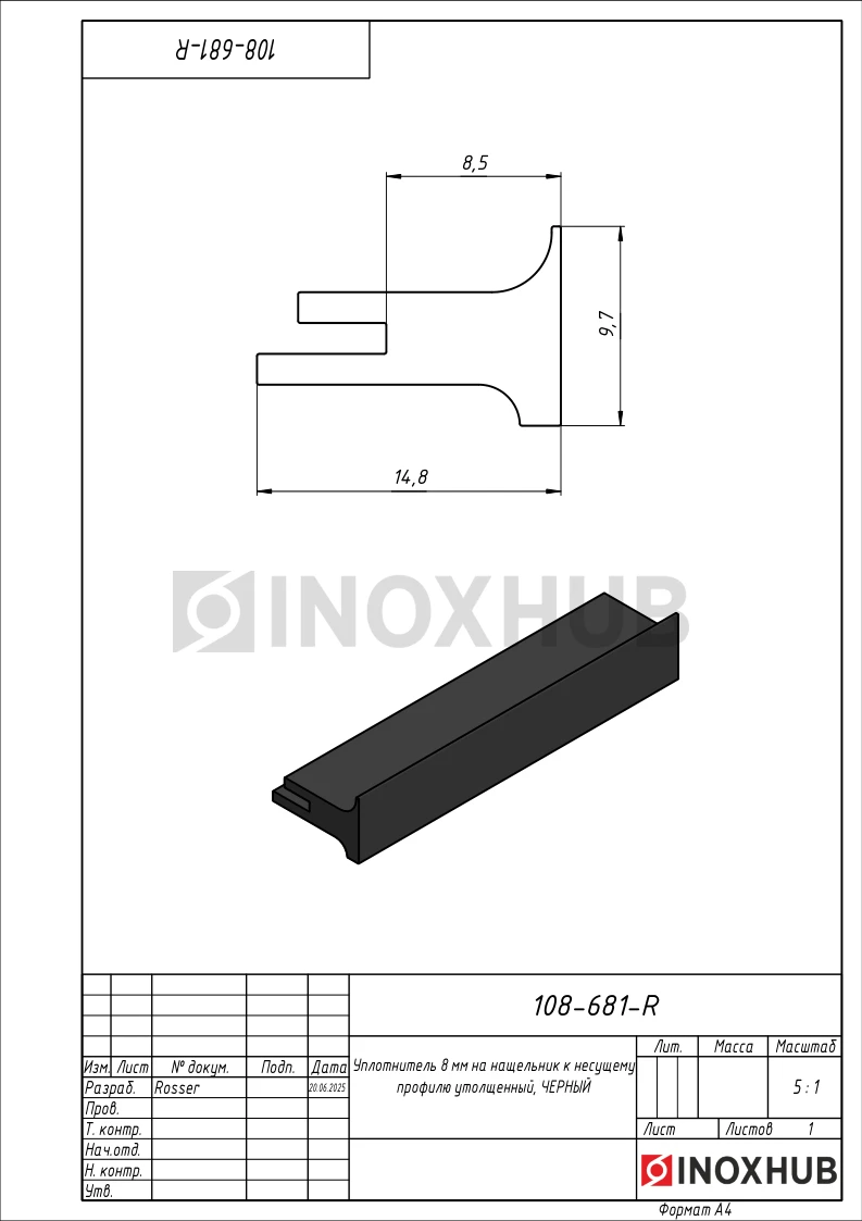 Уплотнитель 8 мм на нащельник к несущему профилю утолщенный, ЧЕРНЫЙ