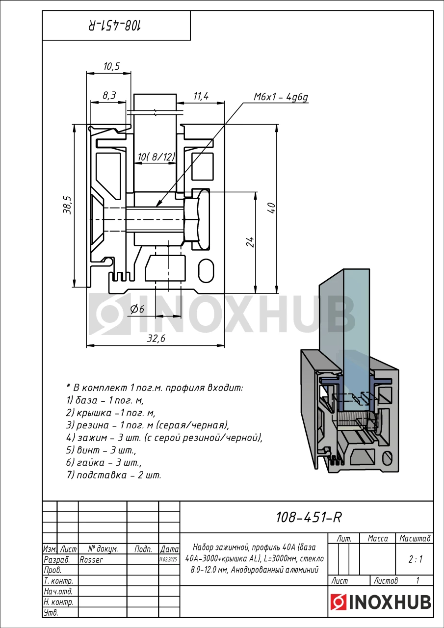 Набор зажимной, профиль 40А (база 40А-3000), L=3000мм, крышки Анодированный алюминий