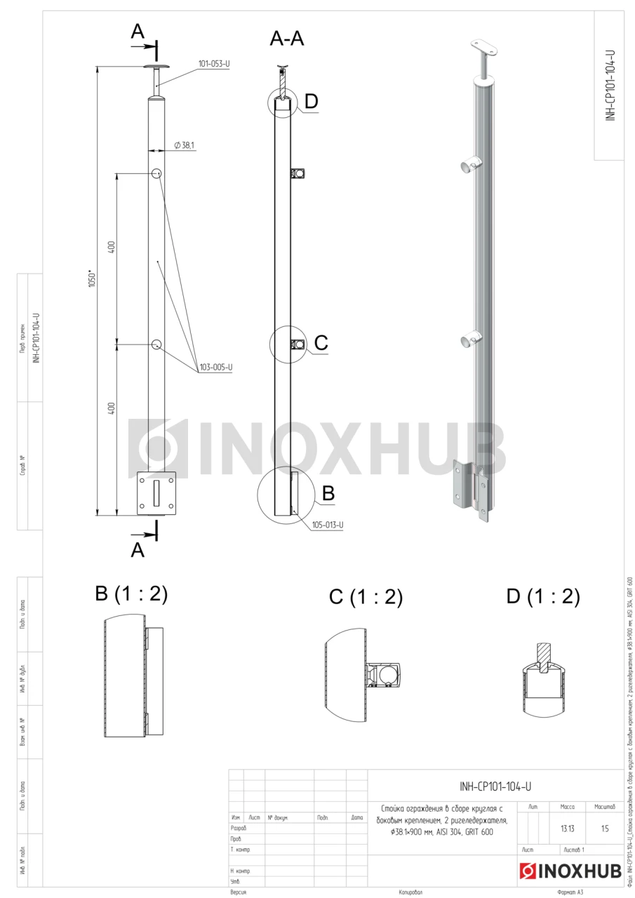 Стойка полностью готова к установке и не требует предварительной сборки. Все элементы уже надежно соединены между собой: труба диаметром 38.1 мм, держатели ригелей, регулируемый наконечник под поручень и боковое крепление представляют собой единую, жесткую, сваренную конструкцию. В процессе производства швы тщательно шлифуются и полируются. Высота стойки — 900 мм, поверхность полированная.