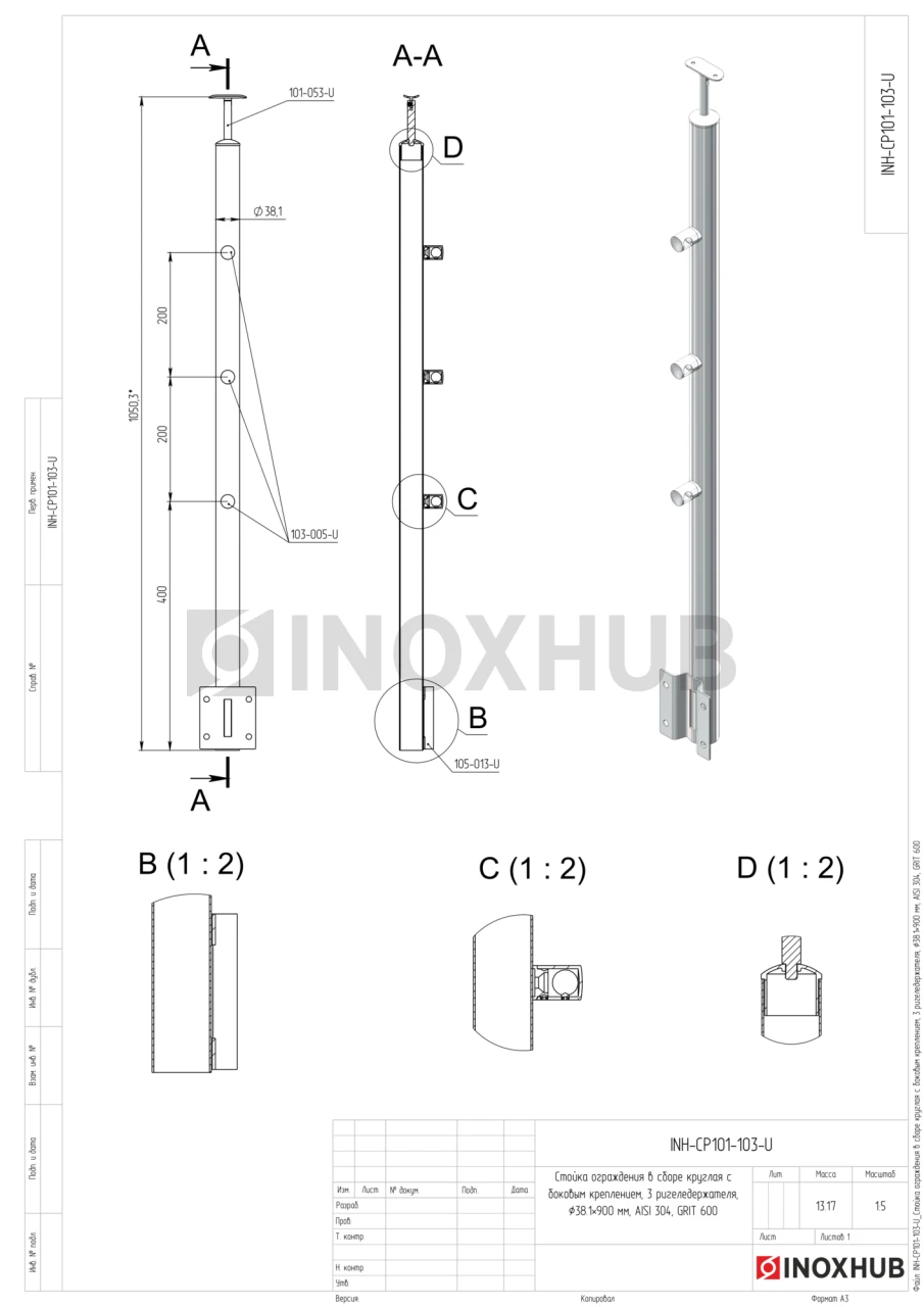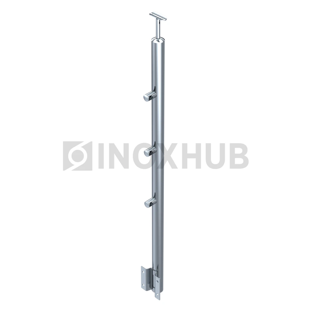 Стойка ограждения в сборе круглая с боковым креплением, 3 ригеледержателя, Ø38.1×900 мм, AISI 304, GRIT 600