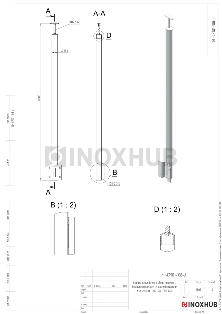 Стойка ограждения в сборе круглая с боковым креплением и наконечником, Ø38.1×900 мм, AISI 304, GRIT 600