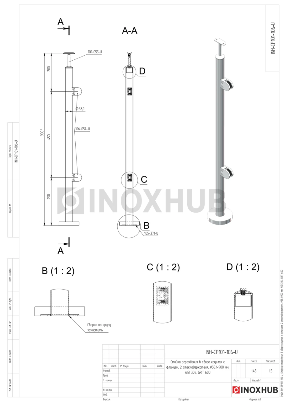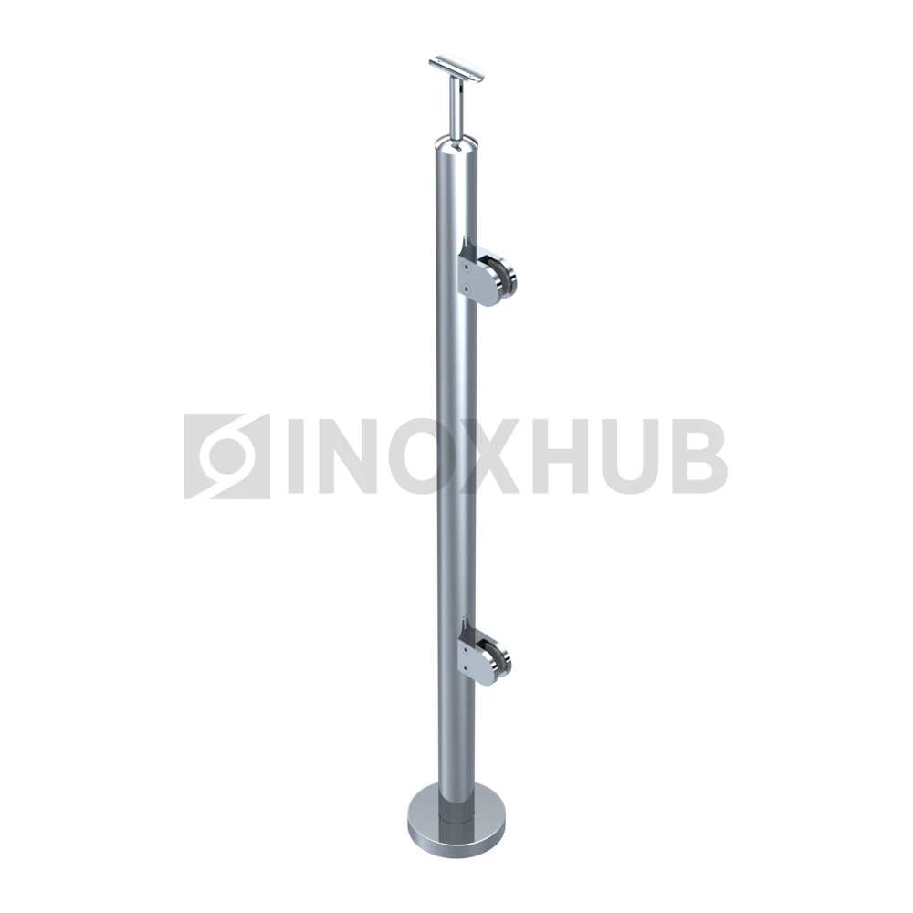 Стойка ограждения в сборе круглая с фланцем, 2 стеклодержателя, Ø38.1×900 мм, AISI 304, GRIT 600