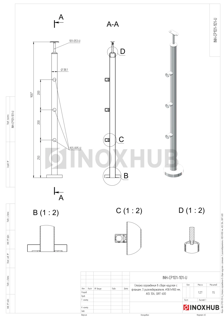 Стойка ограждения в сборе круглая с фланцем, 3 ригеледержателя, Ø38.1×900 мм, AISI 304, GRIT 600