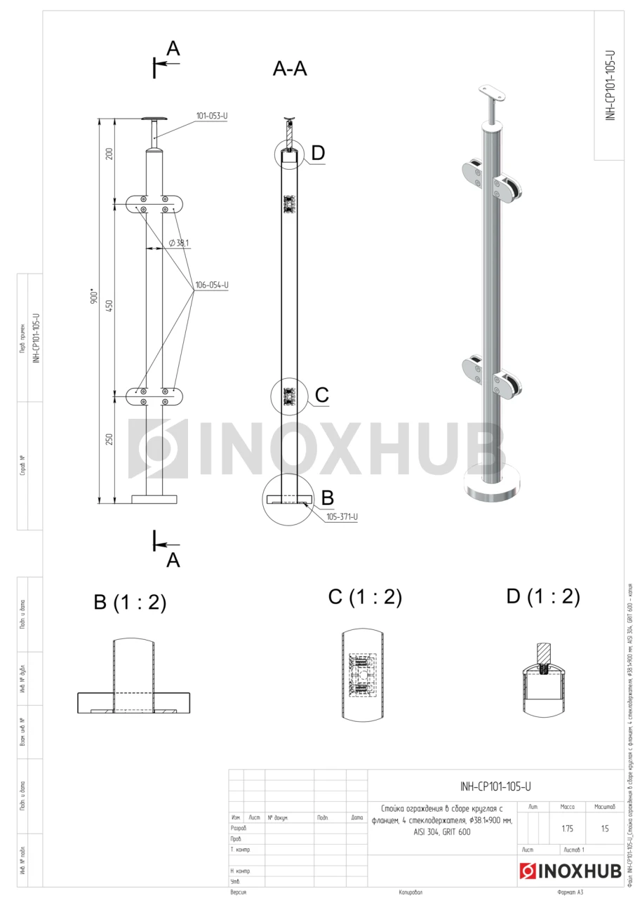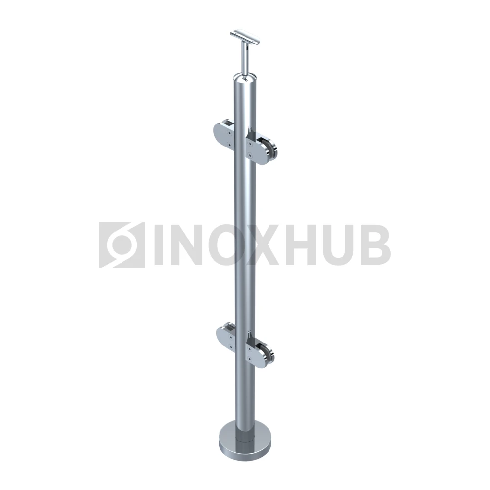 Стойка ограждения в сборе круглая с фланцем, 4 стеклодержателя, Ø38.1×900 мм, AISI 304, GRIT 600