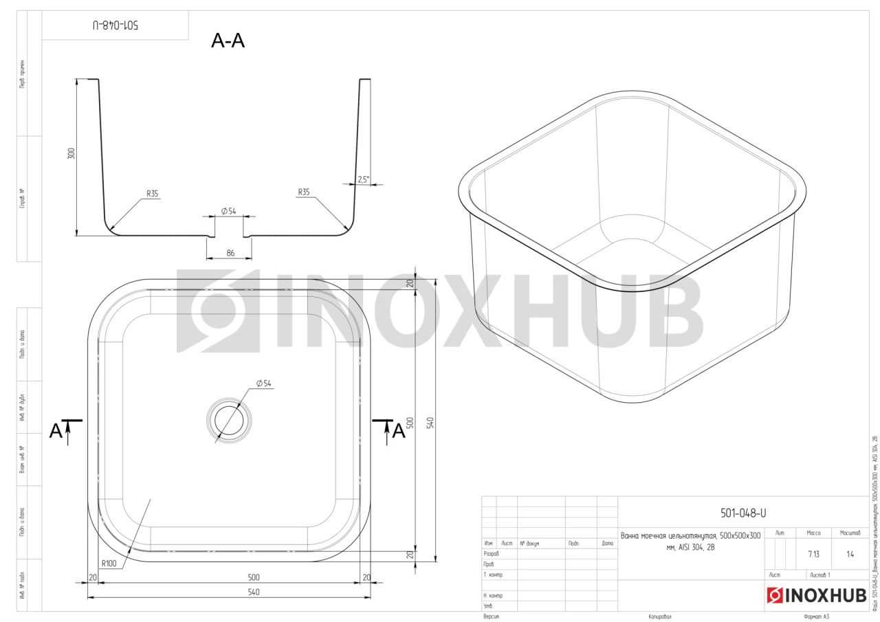 Моечная ванна изготовлена из цельного листа нержавеющей стали AISI 304, без швов и стыков. Используемая в производстве сталь обладает повышенным качеством, изделие устойчиво к износу, в том числе коррозии. Поверхность матовая — 2B, благодаря чему она дольше сохраняет свои эстетические качества (на ней не будут заметны царапины и т.п.). Размеры изделия — 500×500×300 мм, диаметр отверстия — Ø54 мм.