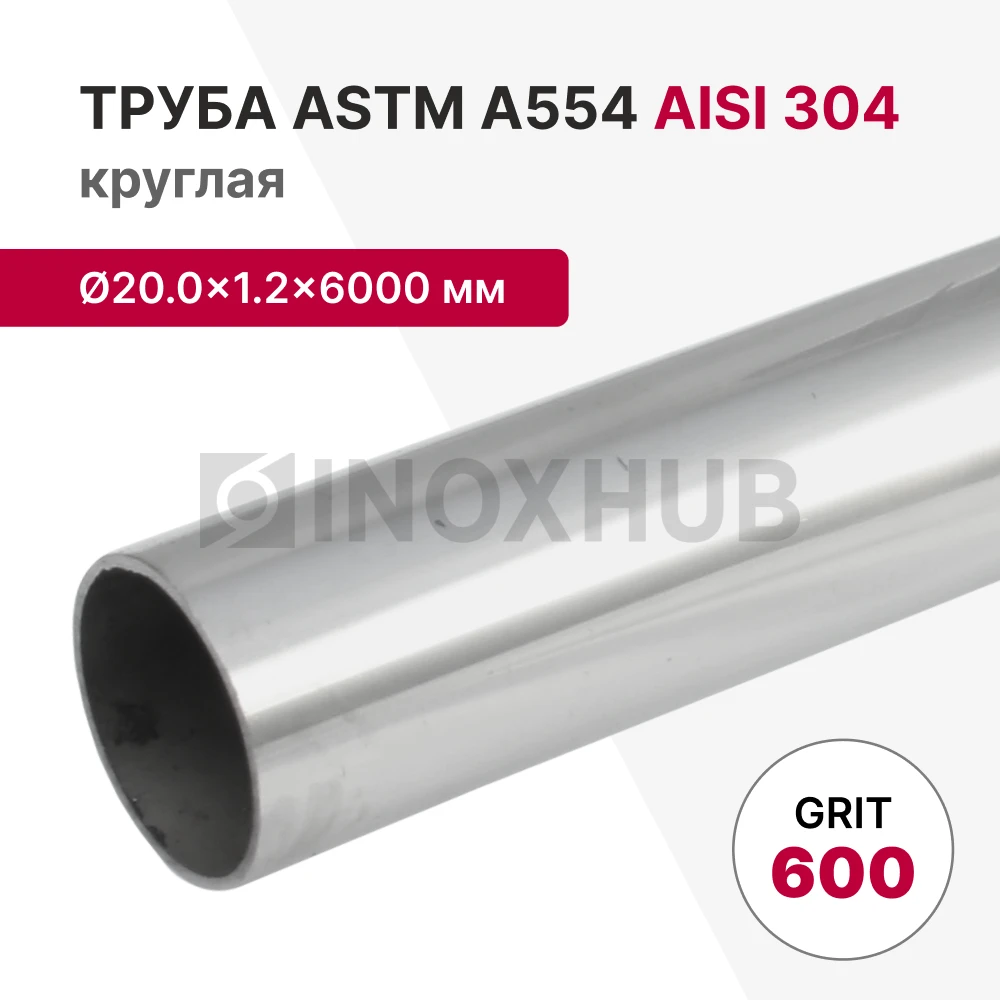 Труба круглая AISI 304, ASTM A554, Ø20.0×1.2×6000 мм, GRIT 600