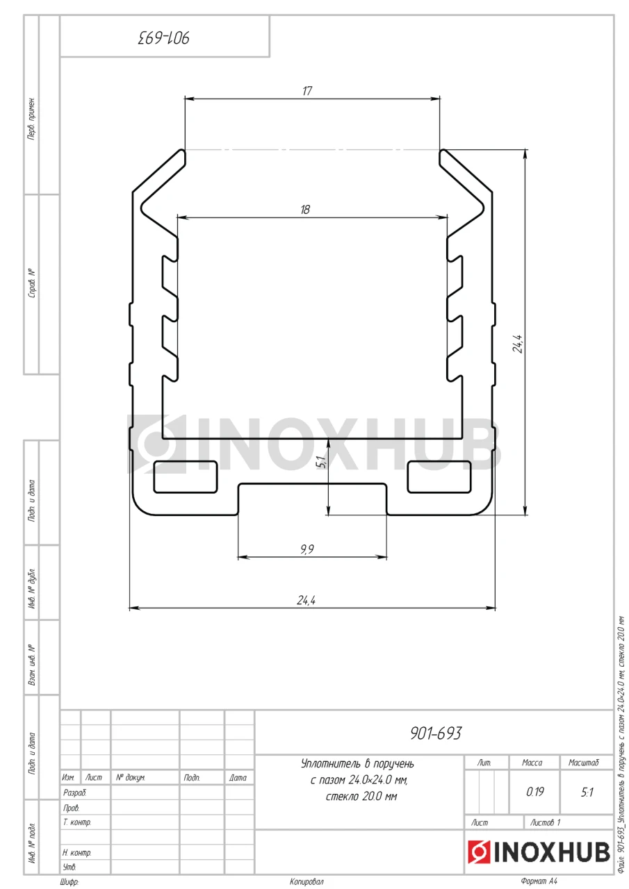 Уплотнитель в поручень с пазом 24.0×24.0 мм, стекло 20.0 мм, кратно 3 м, серый