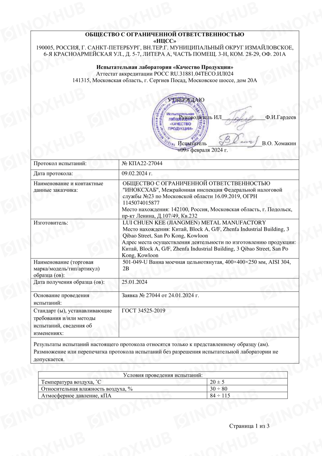 Протокол испытаний №КПА22-27044 от 09.02.2024 года