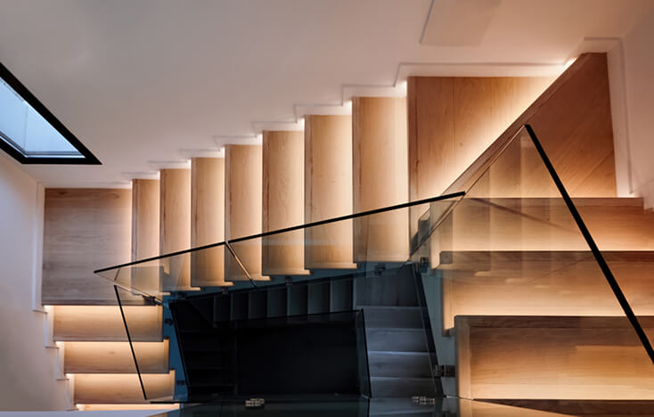 Освещение лестницы важно не только для безопасности, но и для создания атмосферы в интерьере. Сегодня популярны решения с LED-подсветкой ступеней, перил или ниши под маршами. Такое освещение делает конструкцию визуально лёгкой, подчёркивает её форму.